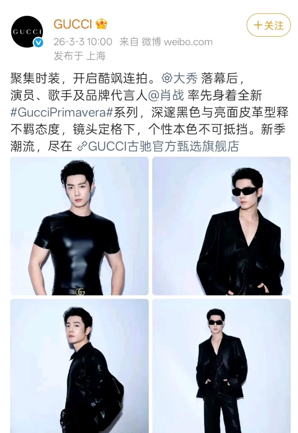 我的今日状态:😁轻松愉快 我这里的天气:🌤️多云 肖战Gucci大片封神!全黑亮面皮革前卫造型,国内外艺人首穿演绎顶级适配度✨ Gucci大秀落幕,代言人肖战率先解锁全新GucciPrimavera系列,用一组全黑亮面皮革大片,再次刷新了时尚圈的认知。 从紧身皮革T恤勾勒出的利落线条,到廓形皮西装的不羁气场,再到搭配双肩包的随性姿态,肖战将前卫先锋的设计语言,演绎得既高级又充满个人魅力。 作为国内外艺人中首位演绎该系列的明星,他用无可挑剔的表现力,完美诠释了“人衣合一”的顶级适配度。 深邃的黑色与亮面皮革碰撞,释放出强烈的视觉冲击。肖战的每一个眼神、每一个pose,都精准踩中了Gucci想要表达的“不羁态度”,让前卫设计不再是遥不可及的概念,而是变成了他身上浑然天成的时尚标签。 肖战Gucci大片 前卫时尚