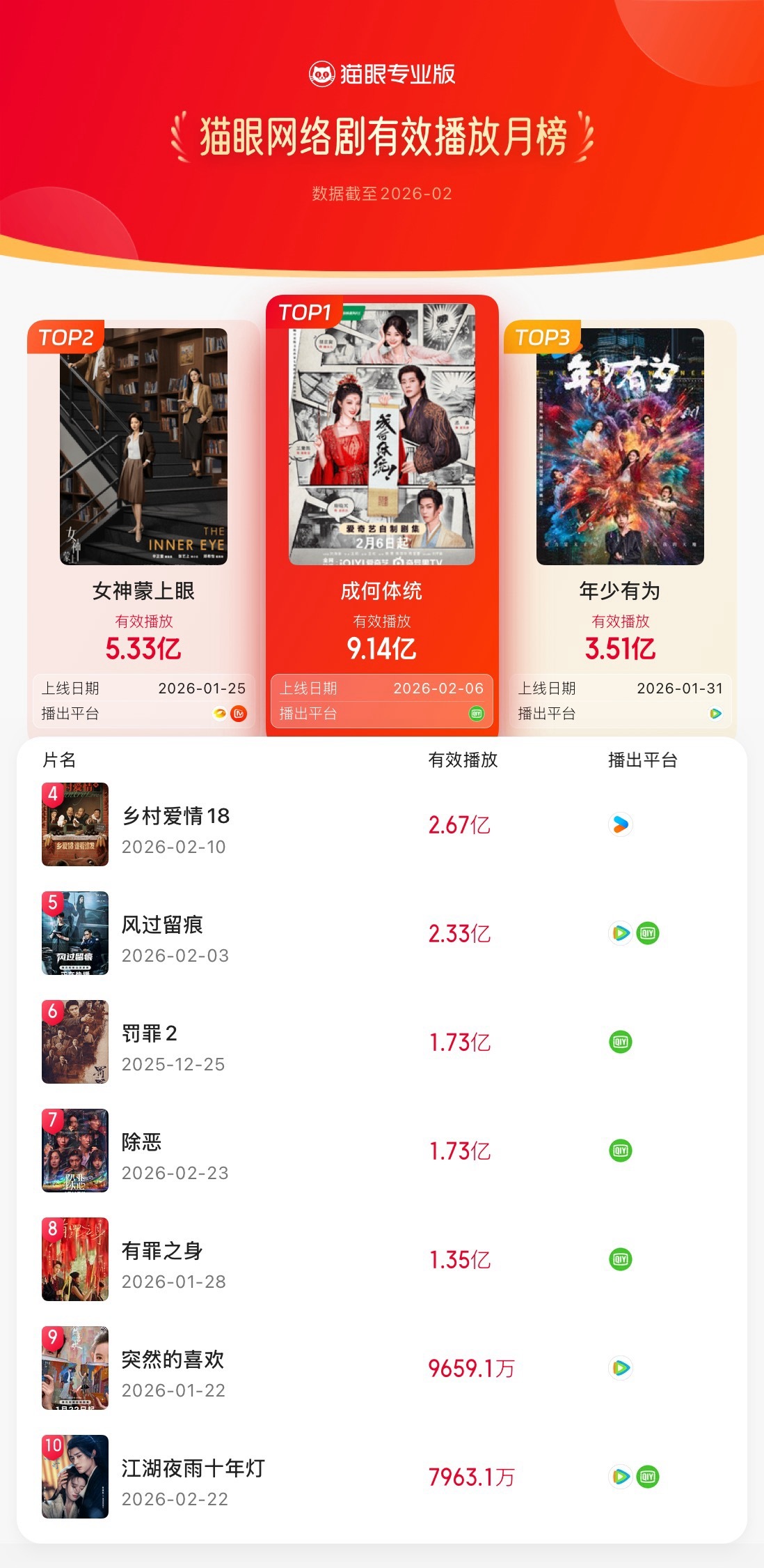 猫眼2月网络剧有效播放榜 猫眼专业版2026年2月猫眼网络剧有效播放榜冠军:领衔主演网络剧《成何体统》亚军:领衔主演网络剧《女神蒙上眼》季军:领衔主演网络剧《年少有为》猫眼2月剧集有效播放榜