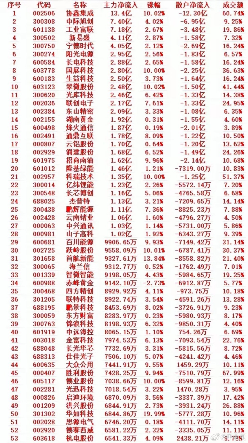 3月3号开盘30分钟,主力资金“买入的 ”个股名单一览1 002506 协鑫集成 13.4亿 10.02% -12.30亿 60.74%2 300308 中际旭创 7.40亿 4.02% -6.95亿 9.25%3 601138 工业富联 7.18亿 2.67% -3.48亿 19.86%4 300502 新易盛 4.11亿 2.87% -1.58亿 7.32%5 300750 宁德时代 4.05亿 2.12% -2.69亿 16.24%6 300274 阳光电源 2.95亿 2.56% -1.83亿 6.57%7 600584 长电科技 2.88亿 2.65% -1.58亿 16.24%8 603778 国展科技 2.80亿 10.00% -2.25亿 36.63%9 600183 生益科技 2.50亿 3.73% -1.64亿 16.24%10 603123 翠微股份 2.48亿 10.02% -1.50亿 41.44%11 300620 光库科技 2.46亿 6.42% -1.33亿 14.38%12 002036 联创电子 2.17亿 7.61% -1.33亿 24.95%13 002384 东山精密 2.09亿 3.33% -1.08亿 6.35%14 002155 湖南黄金 1.92亿 0.31% -1.55亿 4.60%15 600498 烽火通信 1.87亿 0.19% -2.01亿 3.89%资金结构:主力全线净流入,绝大多数个股散户净流出,属于典型的机构抢筹、散户割肉 / 踏空行情,筹码向主力集中。板块主线:光伏储能、光通信 / CPO、算力硬件、半导体封测为资金主攻方向,大市值龙头如宁德时代、工业富联、中际旭创获重点加仓,赛道权重搭台。强势特征:协鑫集成、国展科技、翠微股份、科瑞技术等多股涨停,首航新能、华如科技大涨超 15%,低位 + 题材 + 趋势个股弹性最强。成交额与人气:高成交额个股集中在光伏、光模块,资金抱团核心赛道,短线情绪与中线趋势共振,做多动能充足。策略指向:当前是主力主导的趋势上行行情,散户流出不构成反转压力,反而说明筹码稳固,重点关注主力净流入大、涨幅健康、赛道正宗的标的。