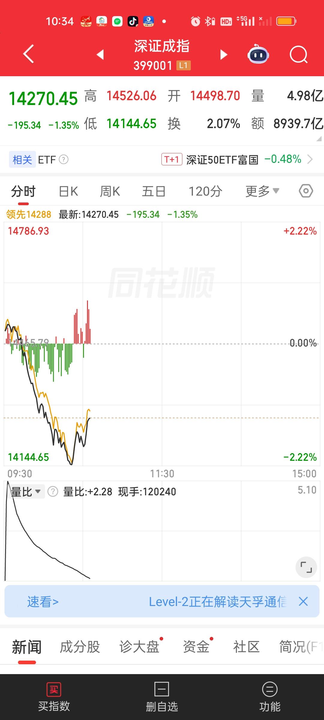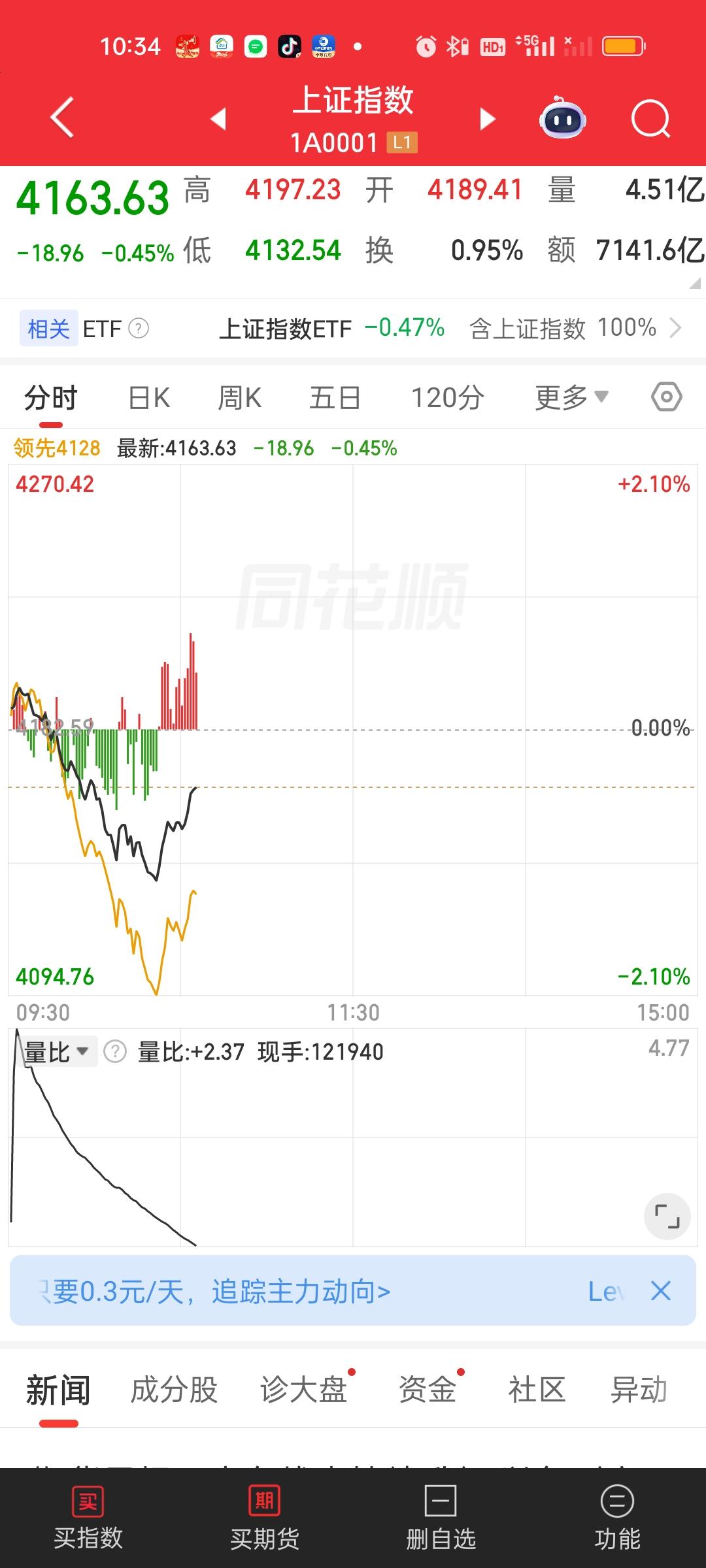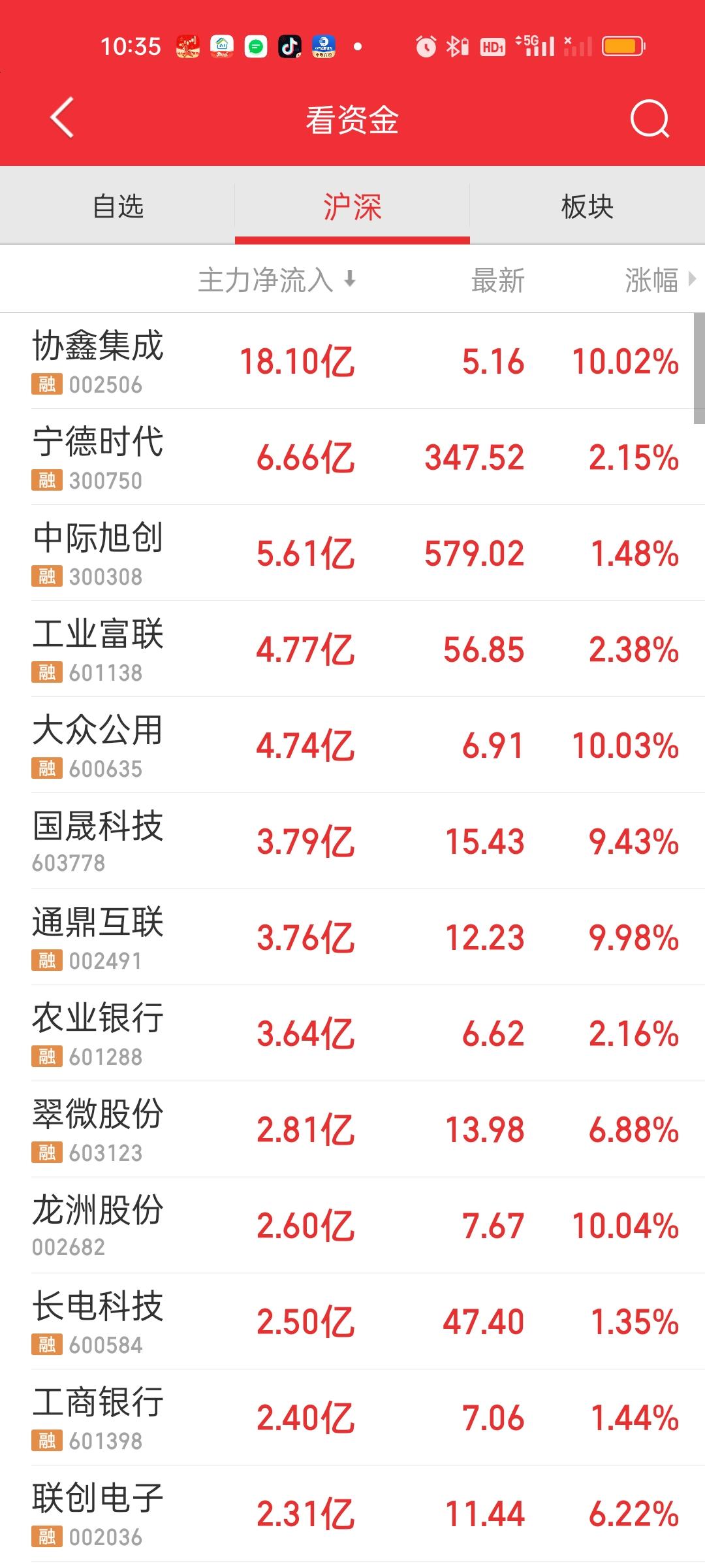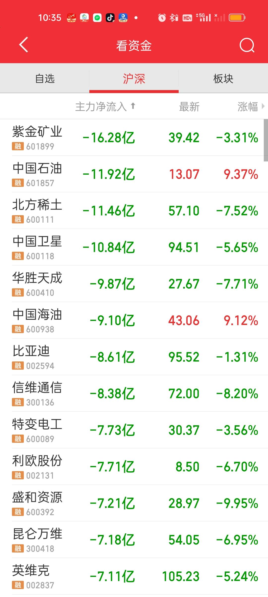 相比昨天,今天这个短时间内超过65个点的急速下杀威力是巨大的,这里是在缩量的情况下跑了1300亿,这说明在这个地方肯定引起恐慌了,很多人因为扛不住,在这里割肉了。但你只要割肉它就开始拉升,一点脾气都没有。 主力资金净流入方面,只有协鑫集成一只个股主力资金净流入超过10亿,主力资金净流出方面,紫金,中石油,北方稀土和中国卫星净流出资金超过10亿。华胜天成和中国海油接近10亿。