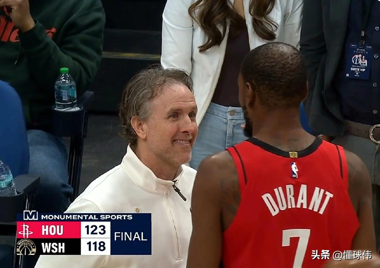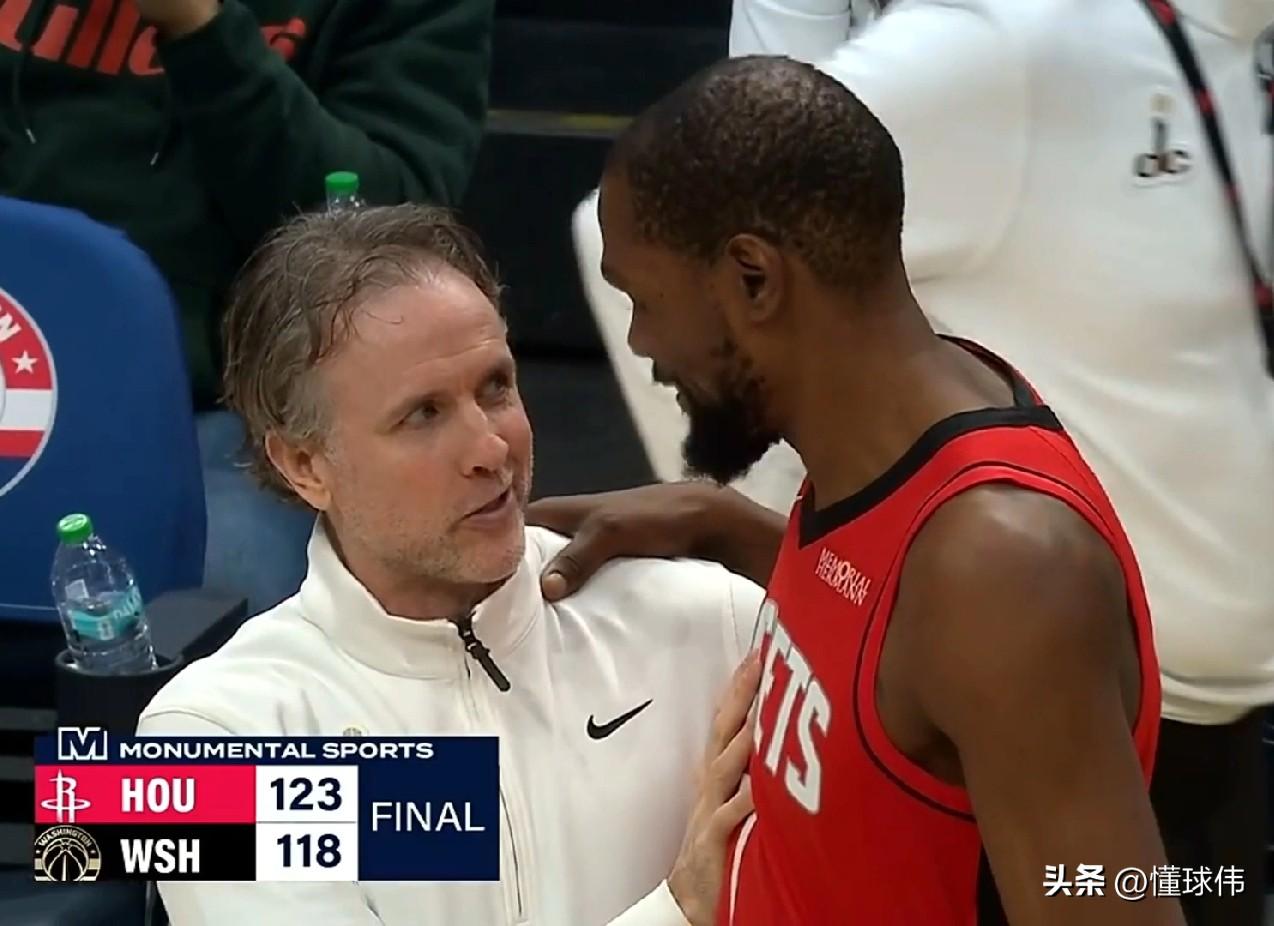 最好得分手!奇才主教练布莱恩基夫谈杜兰特: “KD依旧是最好的得分手。” “可以在任意位置得分。” “我们对于KD的防守很有针对性。” “但他依旧能够一直得分。” “这就是他绝对的个人能力。” 阿杜今天15投8中,三分球6中3,得到30分7篮板1助攻1盖帽! 本来是一场轻松的比赛,但是杜兰特今天又打了37分钟! 这火箭队,真是打谁都是五五开! 就算是大比分领先,也是非常容易被对手追回来! 这种情况下,乌度卡只能求稳,让杜兰特一直在场上! 最后时刻,杜兰特连续出现两次失误,被对手连续打出反击! 阿杜太想下班了,不是很专注! 乌度卡还是要适当给杜兰特减压,不然伤病隐患太大了! 赛后,奇才主教练基夫跟杜兰特聊得很开心! 对于杜兰特,基夫给予了绝对的肯定,这也是对杜兰特实力的最大认可!