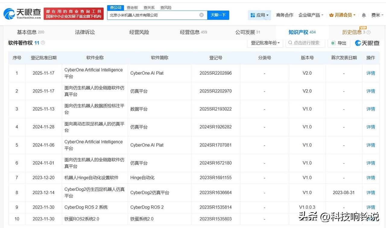 【小米去年登记第三代人形机器人著作权 小米现有多项仿生机器人著作权】小米人形机器人已能自主工作3小时 据媒体报道,近日,小米公布了人形机器人在汽车工厂自主作业的视频,其已经能够连续工作3个小时。 天眼查知识产权信息显示,去年10月,北京小米机器人技术有限公司登记“第三代人形机器人CyberOne”作品著作权,作品类别为美术。此外,该公司还拥有“面向仿生机器人的全链路软件仿真平台”“面向仿生机器人数据质检标注平台”“CyberDog2仿生四足机器人仿真平台”软件著作权。 天眼查信息: