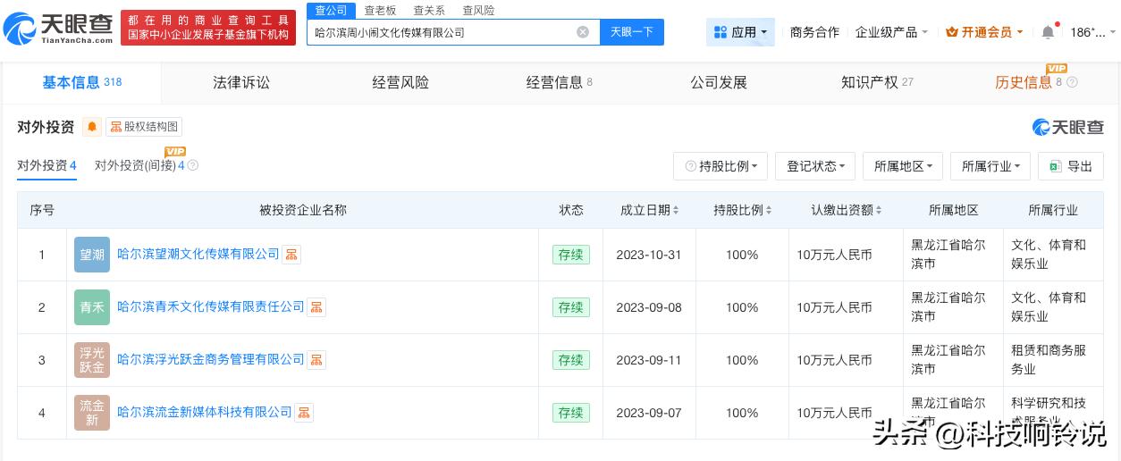 【紫薯精周小闹已成立传媒公司 周小闹公司对外投资4家公司】刘文祥麻辣烫 据报道,近日,短视频创作者周小闹在《饭店寒假工》系列中塑造的爆款角色“紫薯精”,因魔性台词意外带火连锁麻辣烫品牌“刘文祥”。 天眼查App显示,网红周小闹关联公司哈尔滨周小闹文化传媒有限公司成立于2021年1月,法定代表人为周昊(周小闹),注册资本150万人民币,经营范围包括个人互联网直播服务、广告制作、市场营销策划等。股东信息显示,该公司由周昊、多好壹(上海)文化传媒有限公司、刘佳共同持股。对外投资信息显示,该公司对外投资4家公司,均为存续状态,包括哈尔滨望潮文化传媒有限公司、哈尔滨青禾文化传媒有限责任公司等,版图涉及文化传媒、商务管理等领域。 第三方数据显示,周小闹视频平台近7日涨粉136.35万。 天眼查信息: