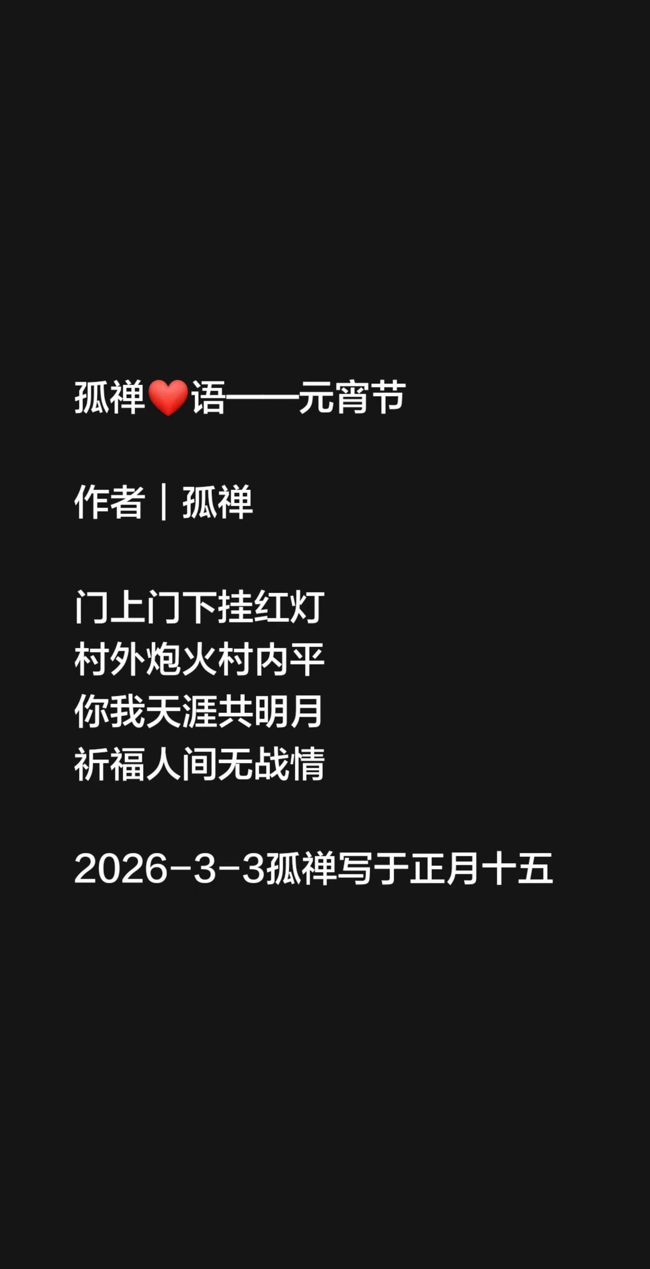 孤禅❤语元宵节祈求世间所有的战争早日结束阖家团圆诗词原创孤禅诗词作者|孤禅门上门下挂红灯村外炮火村内平你我天涯共明月祈福人间无战情2026-3-3孤禅写于正月十五