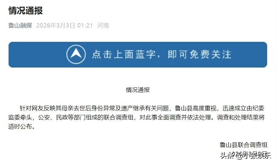 人以去世,被登记再婚?这么离谱? 人已经入土为安,却在法律上“死而复生”,还被人冒用身份登记结婚,亲生女儿连遗产都没法继承。 这是河南鲁山真实发生的荒诞事件,官方已凌晨通报,成立联合调查组全面彻查。 当事人孙女士9岁时,母亲赵芳因病于2008年12月去世,遗体土葬,未办理正规死亡证明。 谁也没想到,母亲去世仅一年,2009年12月,竟有人用她母亲的身份信息,与她的亲舅舅登记结婚,结婚证上的照片,是舅妈冒名顶替。 这说明,母亲的户籍直到2014年才注销,意味着这位逝者,在法律上“活着”整整6年,还多了一段合法婚姻。 等孙女士长大成年,想要继承母亲留下的房产、珠宝等遗产时,却被公证处告知: 她不是唯一继承人——因为母亲“再婚”,法律上有配偶,甚至还有其他子女。 本该属于她的遗产,被人一步步转移、侵占,她连母亲最后留下的东西,都守不住。 一边是逝去的母亲被亵渎身份,一边是至亲联手算计,一边是自己维权无门,这种绝望,换谁都扛不住。 事件曝光,2026年3月3日凌晨,鲁山县迅速发布通报,由纪委监委牵头,联合公安、民政等多部门成立调查组, 对母亲去世后被结婚、身份异常、遗产被侵占一事,全面调查、依法处理,结果将适时向社会公布。 目前调查仍在推进中,但从现有信息来看,这起事件已经触碰法律底线。 从法律角度说,冒用逝者身份办理结婚登记,属于弄虚作假、冒名顶替办理婚姻登记,根据最高法、最高检、公安部、民政部联合出台的指导意见,该婚姻登记应依法撤销。 伪造、使用虚假身份证件、死亡证明,涉嫌触犯《刑法》第280条,构成伪造身份证件罪、伪造国家机关证件罪,最高可处七年有期徒刑。 为侵占遗产实施上述行为,还可能涉及诈骗、侵占等罪名,相关责任人不仅要返还财产,还将面临刑事追责。 同时,民政、户籍登记环节的审核漏洞,相关失职渎职人员,也会被依规依纪严肃处理。 网友们的评论,一边倒的愤怒:“这不是亲情,是赤裸裸的谋财害命,吃相太难看”“死人都不放过,为了遗产什么事都干得出来”“到底是怎么通过审核的? 背后有没有人帮忙?必须一查到底”“心疼这个女孩,失去母亲还要被至亲算计”“官方一定要严查严办,给逝者和家属一个公道,堵住制度漏洞”。 大家最关心的,不只是遗产能不能追回,更是为什么身份冒用能一路绿灯,基层治理的漏洞该如何补上。 这起事件,最让人寒心的不是荒诞的操作,而是亲情的彻底沦丧。 本该保护年幼孩子的亲人,却成了侵占财产的黑手; 本该严谨的身份、婚姻登记程序,却成了不法分子的可乘之机。 逝者的尊严、未成年人的权益、法律的权威,都不该被这样践踏。 我们等待官方的最终调查结果,期待所有违法违规人员都被严惩,被侵占的遗产悉数返还,更期待相关部门以此为戒,完善身份核验、死亡注销、婚姻登记、遗产监管等全流程制度,不让悲剧再上演。 最后想问大家:你遇到过这么离谱的事吗?来评论区说说你的看法。