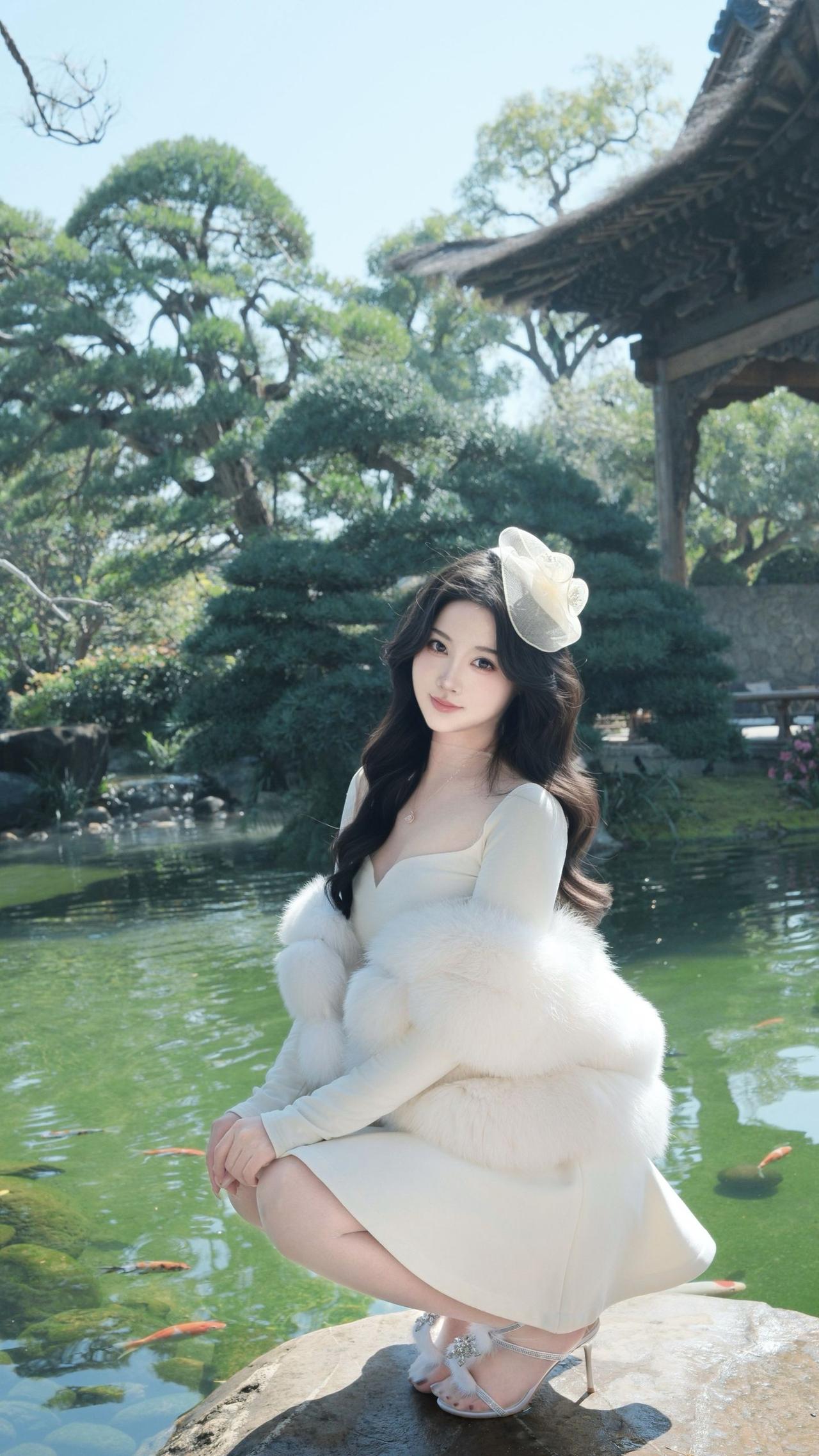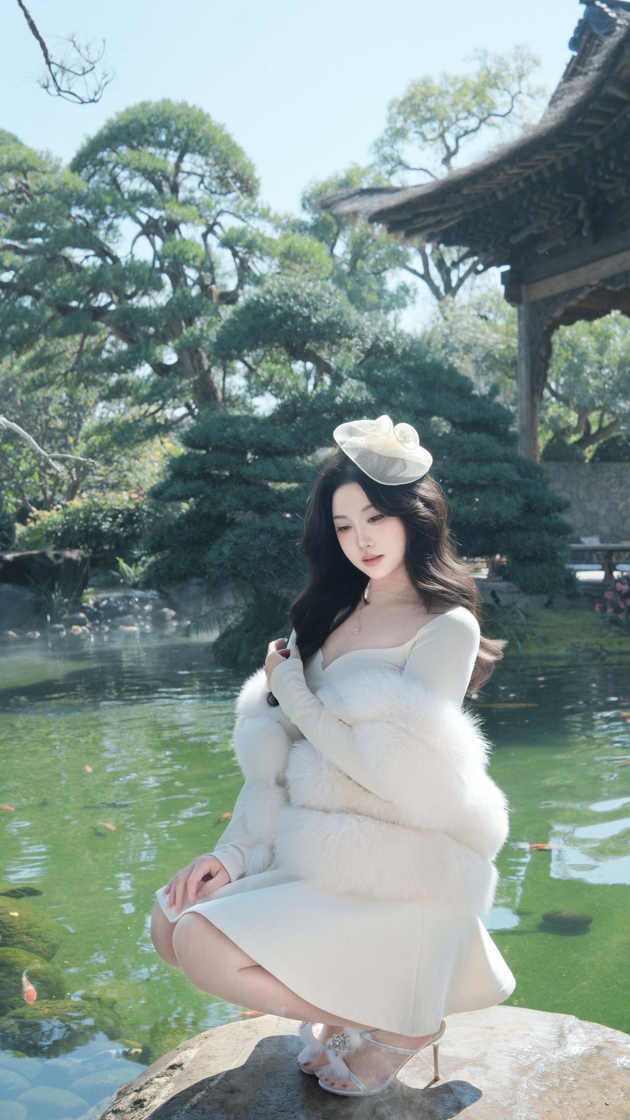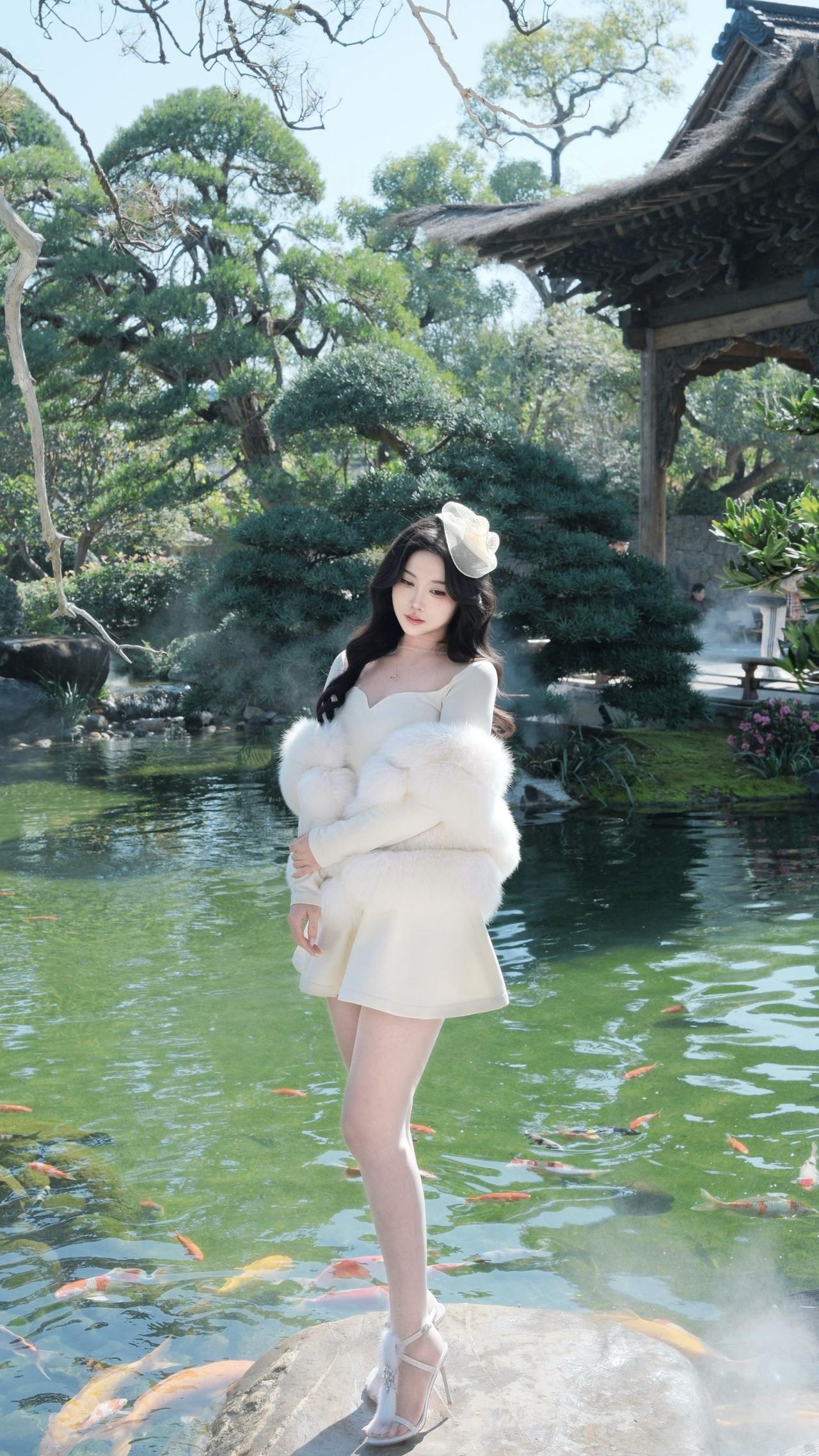 白色毛绒外套内搭同色连衣裙太好看了,优雅精致又有女人味。