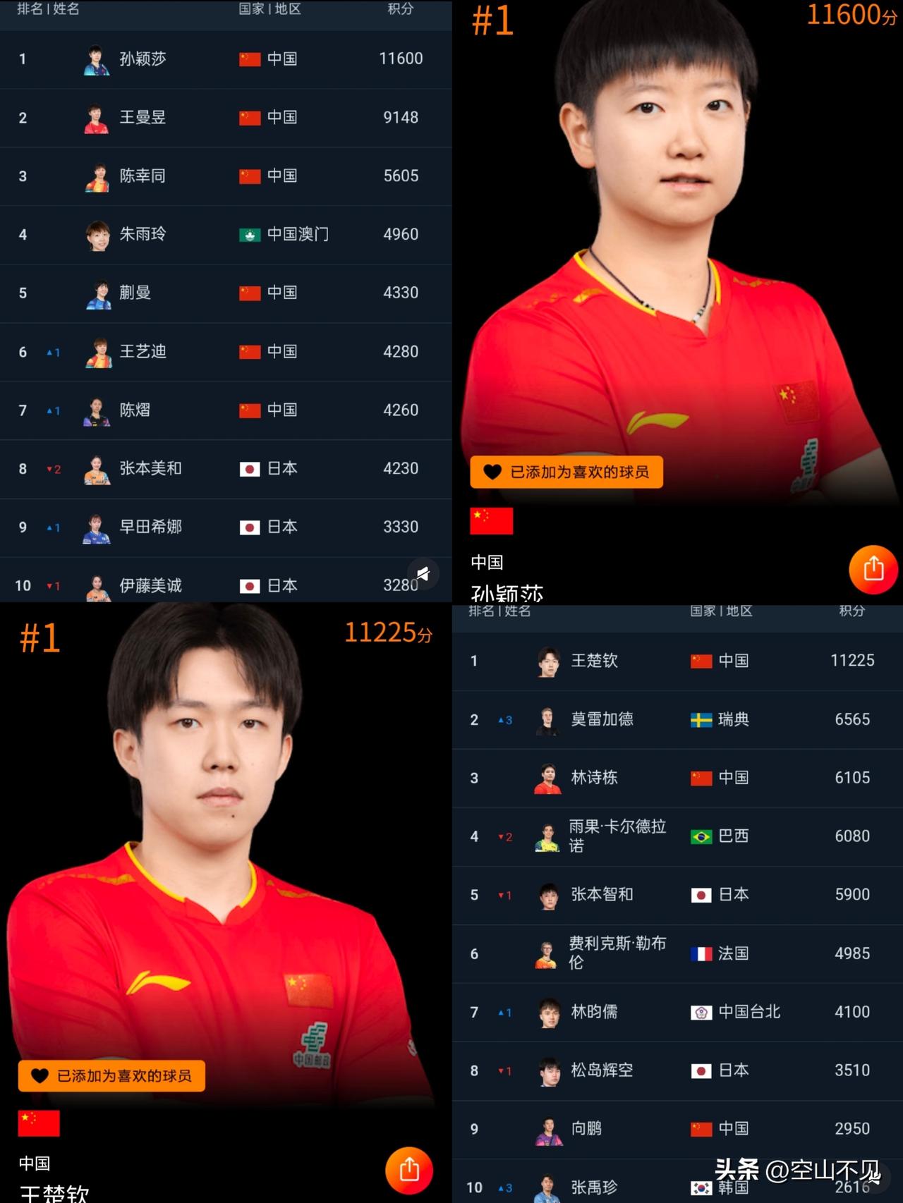 开启万分王朝 好爽啊!万分queen&万分king 这是个万分,双王的时代。 [赞]孙颖颖万分莎王,成功卫冕新满,积分继续领跑女乒。你付出的努力和汗水只有你知道,杀不死你的必将使你更强大。 [赞]王楚钦万分狮子王,高积分是靠一场场的胜利拼出来的,在男线竞争如此激烈的情况下能绝对领先,确实不易。 [赞]00后双子星,从年少并肩作战到国乒主力,继续为梦想拼搏。王楚钦