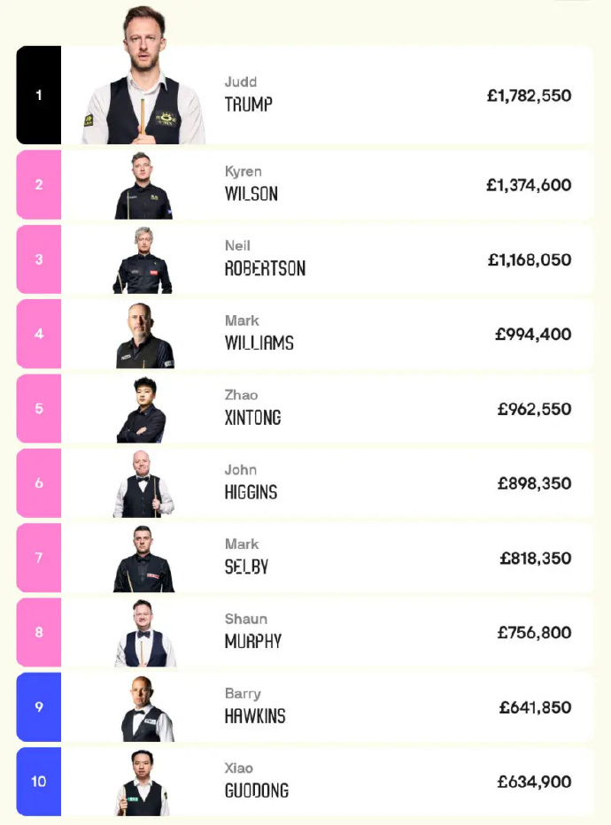中国军团表现依旧亮眼:赵心童稳居第 5,肖国栋第 10,吴宜泽排名再提升来到第 11,丁俊晖位列第 14,斯佳辉第 16、张安达第 21。