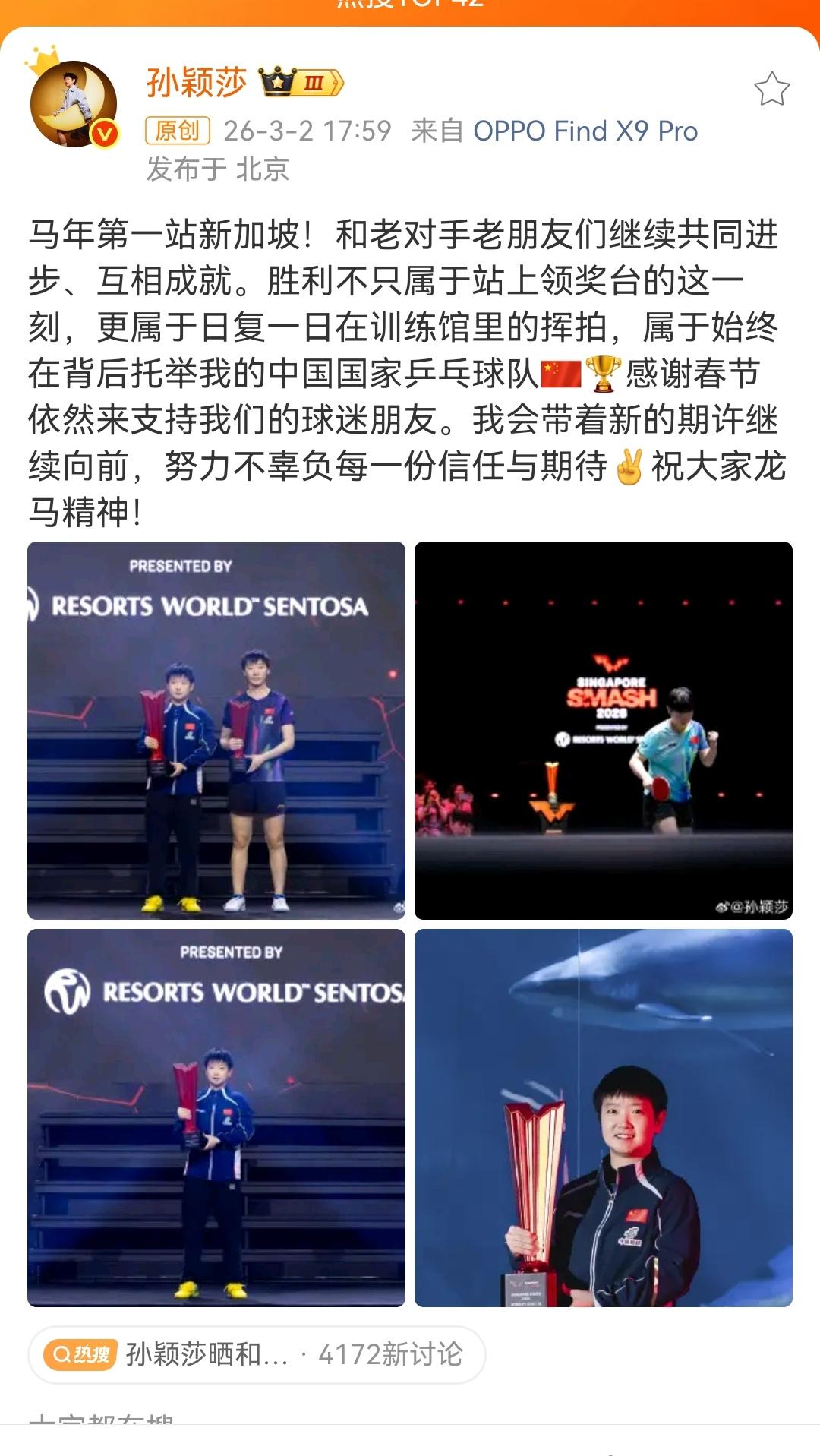 莎莎一定非常喜欢这张她的背后有两条鲨鱼🦈的城市宣传照,在她新加坡大满贯回来后更新的微博里面最后一张就是背后有两条鲨鱼🦈的图片。 鲨鱼🦈是来自远古时代的物种,距今已经有4.2亿年,鲨鱼🦈是海洋里非常强大的掠食者,大白鲨的寿命40-70年,鲸鲨的寿命有70-130年,格陵兰鲨的寿命可达400年以上。 我们喜欢的莎莎,外表软萌可爱,赛场上却是反差极大的另外一副模样,懂乒乓球的人都说孙颖莎的球商非常高,简单通俗的说法就是,孙颖莎在场上面对不同的对手,她可以在短时间内迅速发现对方的弱点,从而制定有效的方案一举拿下对手。 孙颖莎的身高162,在乒乓球选手里面这个身高并不占优势,孙颖莎通过自己的努力,加快脚下的步伐移动和正手的力量稳稳占据世界第一的位置。 2025香港年度总决赛孙颖莎因伤退赛,经过一段时间的修养调整,重回赛场的孙颖莎连续拿下了亚洲杯女单冠军和新加坡大满贯两站女单冠军,我们期待也祝福莎莎保持乒乓球的霸主地位,加油莎莎!