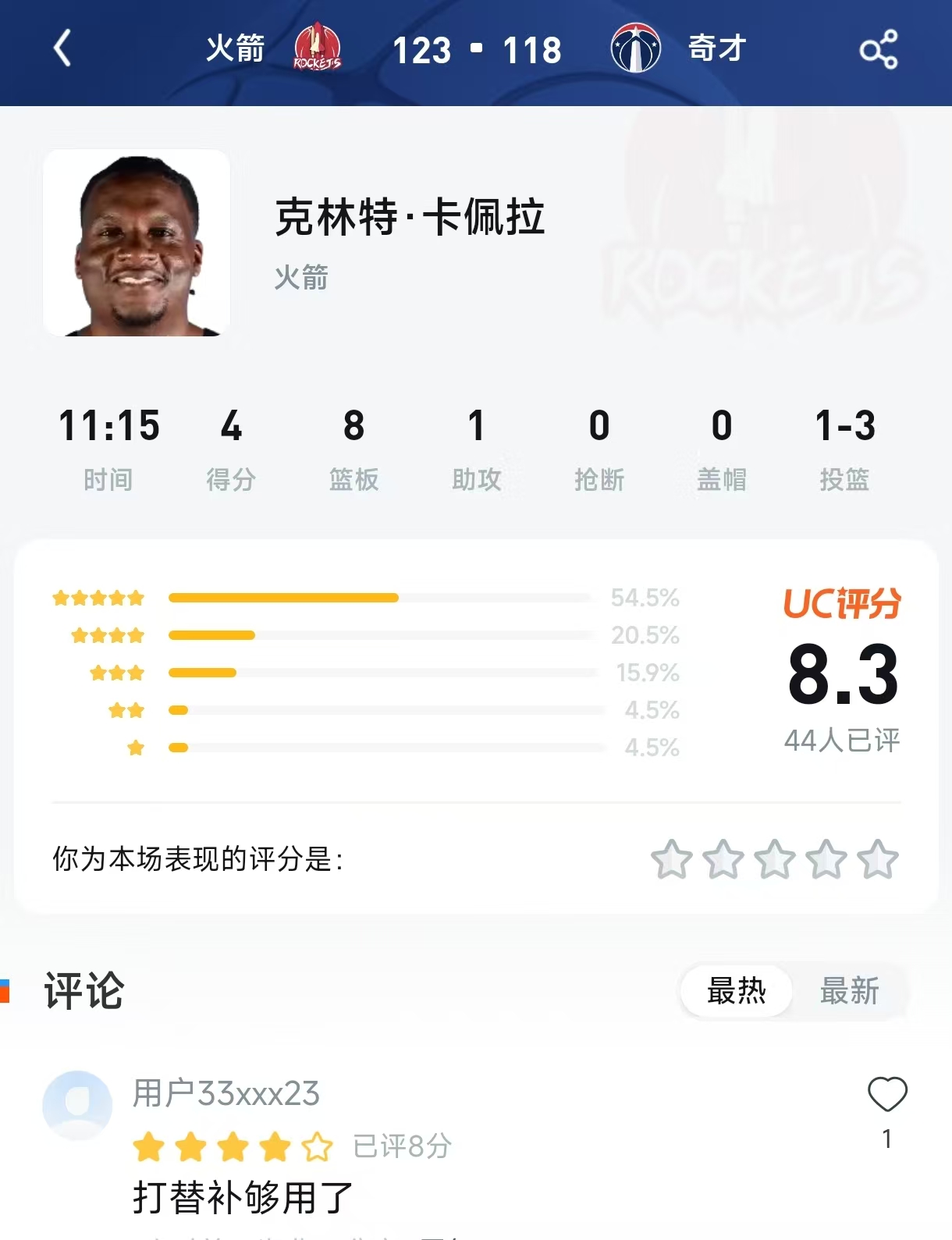 原始UC评分截图(文字还原) 比赛: 火箭 123 - 118 奇才 球员: 克林特·卡佩拉 (火箭) 时间: 11:15 | 得分: 4 | 篮板: 8 | 助攻: 1 投篮: 1-3 UC评分: 8.3(44人已评)