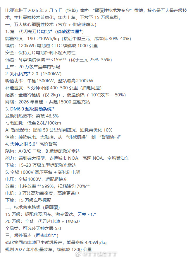 网上看到的关于3月5日比亚迪技术发布会的信息整理。这些要是都能落地,又要卷得飞起了