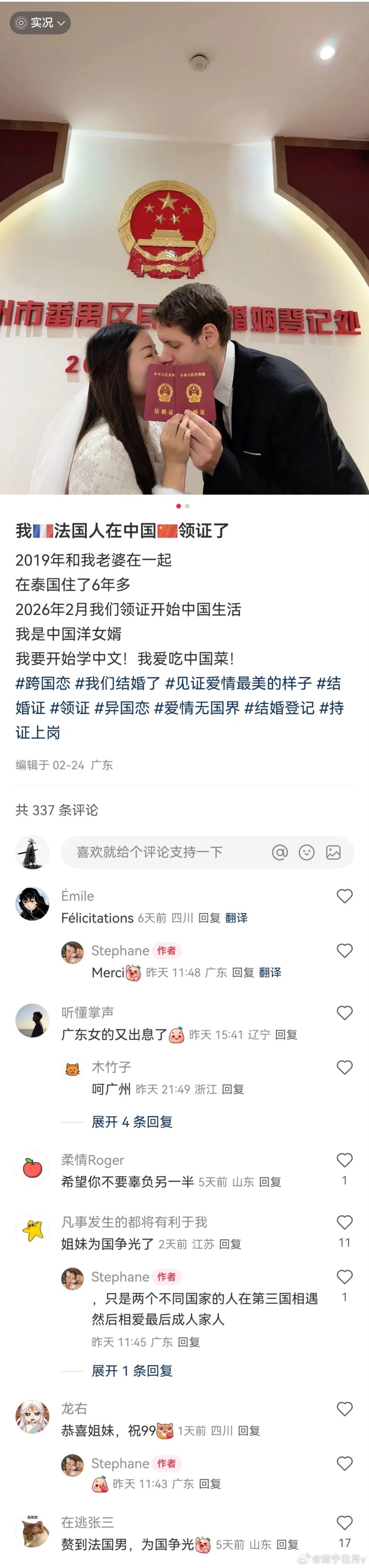 一个法国人发帖娶了个东大女人,底下媚外小仙女大叫“为国争光”