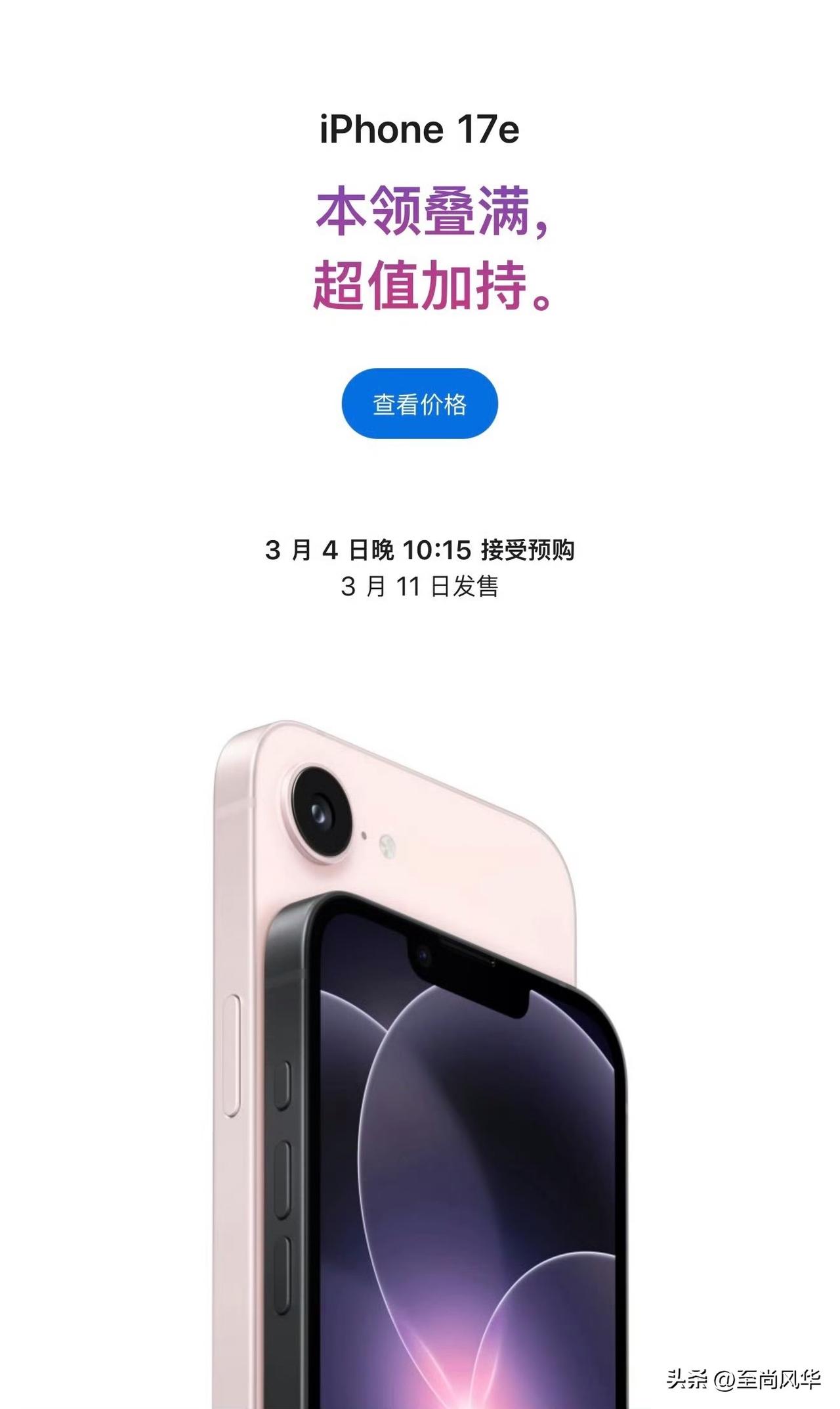 苹果公司已经在中国官网上线了新款手机—iPhone 17e,发布时间为3月4日的上午,开售时间为3月11日。根据相关的爆料信息来看,这款手机的起售价为4499,存储版本为256GB,国补后可降至3999左右;最高售价6499,对应的存储版本为512GB。目前接受预定,可去苹果手机官网查看。