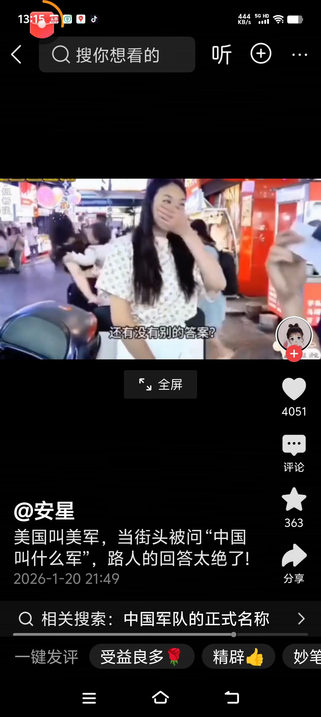 街头采访,问:“美国人叫美军,英国人叫英军,日本人叫日军,请问中国人叫什么?” 几位穿着市场的女士,一个这样回答:“叫中军?不对啊,叫陆军、海军?” 一个思考好久的女士说:“叫消防军?” 年轻人啊!呵呵……