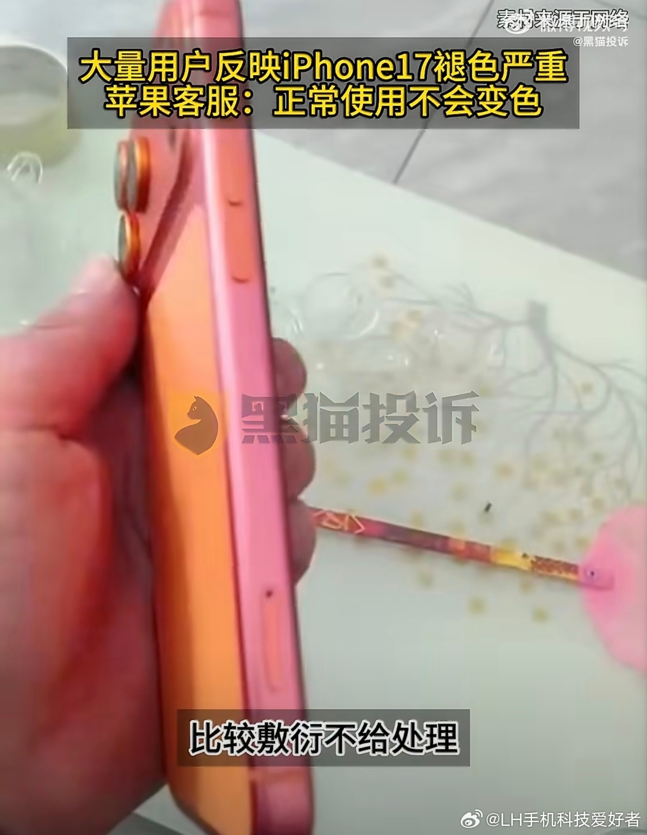 iPhone17只用一个月橙色变粉色iPhone17 Pro Max的机主说用了一个月,手机掉色比较严重,橙色变成了粉色,这个色差确实差距挺大,不知道是个例还是通病,大家有遇到类似的情况吗?