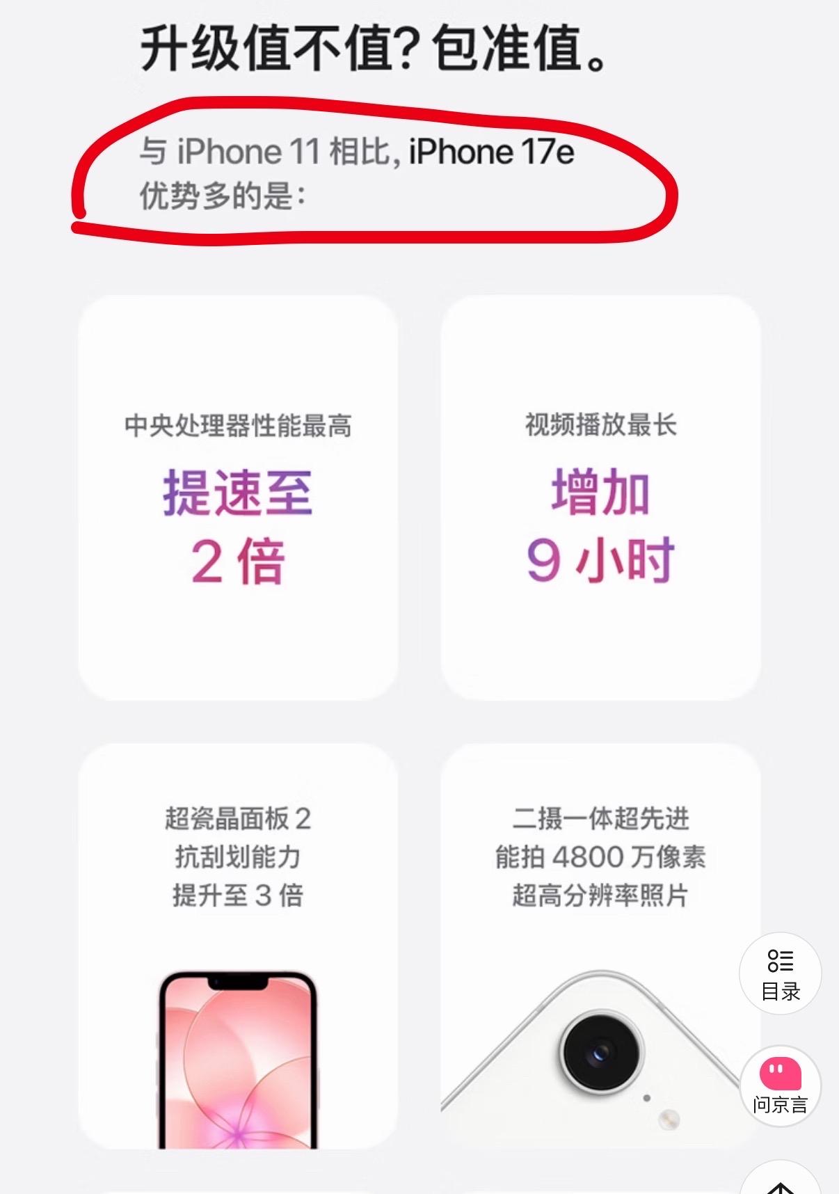 传了这么久的iPhone17e有灵动岛,结果上岛失败,还得是库克刀法精准啊!详情介绍页与iPhone 11做对比,我是不理解的[融化] 配置 - 6.1英寸60Hz OLED刘海屏 - A19处理器、首发Apple C1X基带 - 前置12MP+Face ID、后置48MP - IP68、USB 2、15W MagSafe无线充、重170g - 8+256GB 4499元、8+512GB 6499元