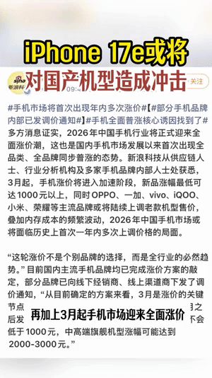 苹果新机已触碰到三千价位手机市场的平衡,被iPhone17e彻底打破。4499元起售价+国补后3999元,苹果以一个意想不到的价格切入主流价位。用品牌力+性价比双重出击,看来国产机型不得不正面迎战这场硬仗了iPhone17e或将对国产机型造成冲击