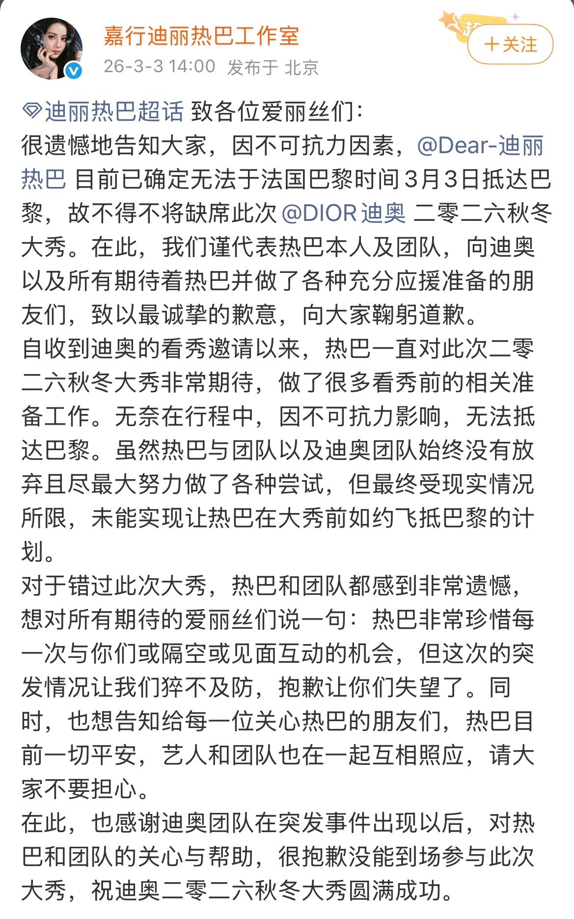 网传消息居然是真的……希望热巴一切顺利,真wwzz了,工作室确实有点拖后腿,虽然事出有因,但这么多国内去看秀的艺人都能安排好行程 ~