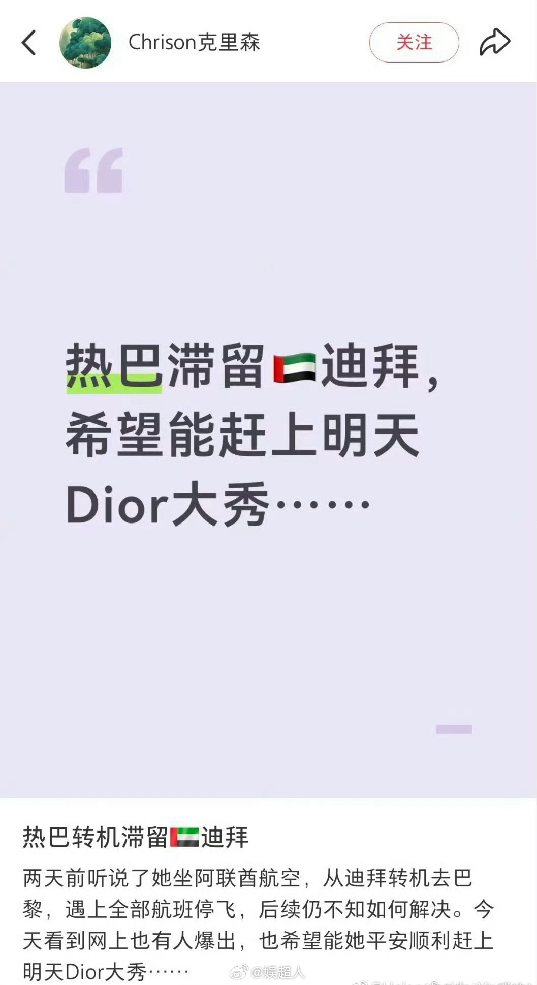迪丽热巴滞留超24小时迪丽热巴滞留迪拜超24小时 天呐!有时尚博主爆料热巴滞留迪拜已经超24小时目前热巴方都已报平安 迪丽热巴将缺席时装周