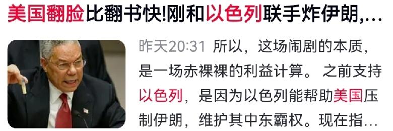 彻底翻脸!美国公开甩锅以色列,所谓铁杆同盟,不过是一场利己骗局 中东局势彻底失控,美国终于撕下伪装,直接将矛头对准以色列,坦言是以方先发制人袭击伊朗,才导致美军基地接连遭袭。 就在几天前,美以还同仇敌忾,美国暗中为以色列提供情报、调配战机、规划打击路线,纵容以方越境突袭,妄图躲在背后坐收渔利。 伊朗没有妥协,更没有局限于反击以色列,而是直接瞄准中东所有美军据点,密集导弹与无人机突袭,让二十多处美军基地重创,伤亡持续攀升。 利益面前,所谓美以同盟不堪一击。有利可图时称兄道弟,自身受损时立刻甩锅推责,这就是美式霸权最真实的嘴脸。 伊朗用强硬反击打破幻想:中东不再是美国随意拿捏的棋盘,小国也有捍卫底线、掀翻规则的底气。美国的傲慢与双标,终将自食恶果。 对此,你怎么看? 美国霸权衰落 美以同盟现原形 伊朗强硬反击