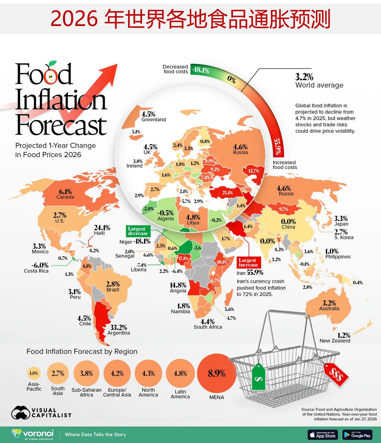 2026 年食品价格上涨最严重的地区将是哪里? 食品价格仍是全球家庭面临的主要持续性成本压力之一。在 2026 年,一些国家的食品杂货费用预计将大幅上涨,而其他一些国家的食品价格则会保持相对稳定。 根据联合国粮食及农业组织(FAO)的最新预测,2026 年全球 160 个经济体的食品价格涨幅将大不相同,有些经济体的食品价格将出现两位数的大幅上涨,而其他一些经济体的食品价格则会大幅下跌。 这张地图根据各国食品价格预计的同比变化情况对 160 个经济体进行了排名,突出了 2026 年家庭可能面临食品价格涨幅最大的地区。 ——面临食品价格涨幅最大的经济体 目前,通货膨胀压力在新兴经济体和依赖进口的经济体中最为严重。 食品价格上涨受货币波动、商品价格、贸易中断以及国内供应状况等因素影响。那些面临货币贬值或持续经济不稳定状况的经济体,其食品成本的上涨幅度往往更为显著。 在排名中位居榜首的是伊朗,该国的食品价格预计同比将上涨 55.9%。 伊朗货币贬值以及长期的通货膨胀压力近年来已将食品价格推至极高水平。2026 年的预测表明,这些压力可能会持续存在。 撒哈拉以南非洲地区的几个经济体——包括尼日利亚(17.1%)、安哥拉(14.8%)、赞比亚(10.8%)和埃塞俄比亚(10.1%)——也处于排名前列之列。在这些国家中,食品价格上涨与货币波动、进口依赖以及供应端的中断密切相关。 ——地区间食品价格波动情况 虽然全球平均水平预计为 3.2%,但各地区的具体数据却显示出 2026 年食品价格走势存在显著差异。 中东和北非地区表现尤为突出,其数值几乎是全球平均水平的三倍。 北美洲处于排名中游位置,预计食品价格将上涨 4.3%。在美国,食品价格预计会上涨 2.7%,而在加拿大,食品价格的涨幅可能会超过这一水平的两倍。 与此同时,亚太地区的大部分地区预计食品价格的涨幅会较为温和。 尽管预计 2026 年全球食品价格的涨幅将降至个位数,但各地区的实际情况却呈现出更为不均衡的态势。对于高通胀国家中的数百万家庭而言,食品开支可能会成为未来一年中持续存在的最大经济压力之一。