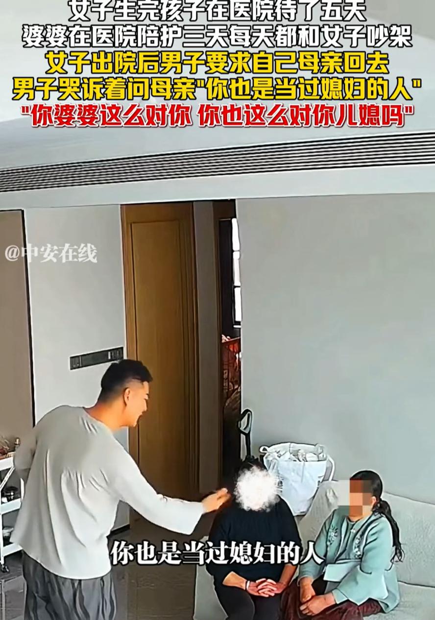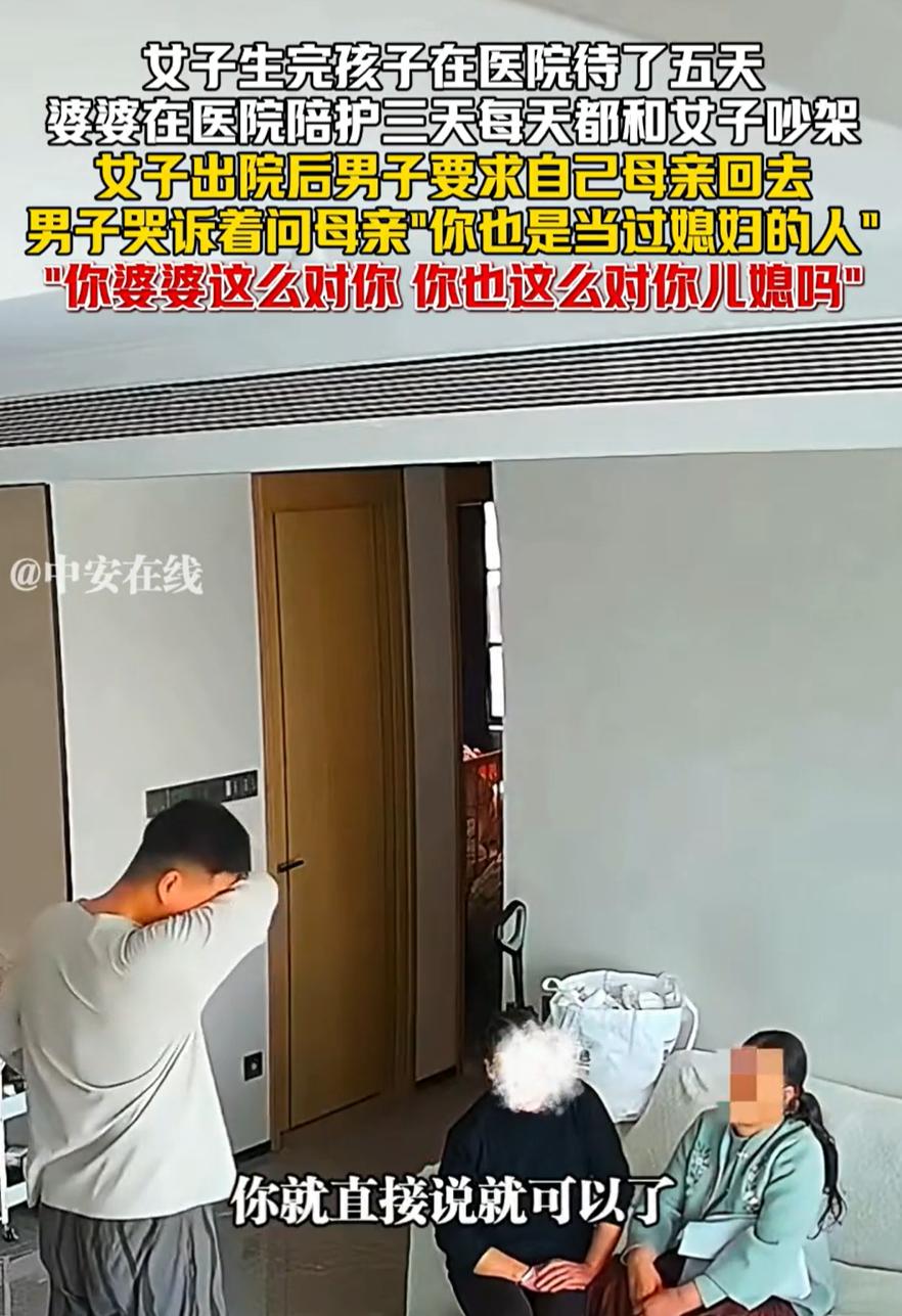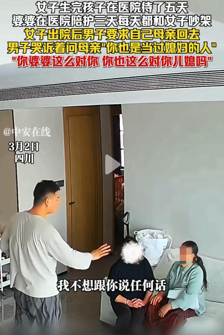 连亲儿子都看不下去了!四川,女子在医院生完孩子后住了五天的院,谁知婆婆来陪护了三天,却天天都和儿媳妇打架,回到家后,儿子得知此事,直接就让母亲离开,他嘴上说着不想听妈妈说任何话,但眼泪还是止不住的流了下来 起初,男子本想着媳妇生孩子是大事,特意把老家的母亲接来医院陪护。他有他的道理:母亲生过孩子,有经验,而且时间上也比自己宽松。按理说,这是个两全其美的安排 没成想,母亲陪了三天,医院里就跟儿媳妇闹了三天。儿媳妇刚生完孩子,身子还虚着,躺在床上连口气都喘不匀,婆婆却各种挑刺,嫌这儿不对,嫌那儿不好 可想而知,能让一个刚生完孩子的产妇,在医院里跟婆婆天天“打架”,这日子得有多难熬 五天住院,婆婆陪了三天,闹了三天,回到家,妻子把这事儿告诉了丈夫。男人没吵没闹,只是平静地走到母亲面前,让她离开 视频里的男人,情绪彻底崩溃。他对着自己母亲,眼泪止不住地往下掉,话却说得斩钉截铁:我不想跟你说话,我不需要,我真的不需要 他问了一句话,问得扎心:你也是当过媳妇的人。你当媳妇的时候,你想让你婆婆怎么对你的? 是啊,哪个当媳妇的没受过点婆婆的气?哪个女人嫁人后,没在婆家小心翼翼地熬过几年?正因为自己经历过,才知道那是什么滋味,才知道那些委屈有多难咽。可偏偏有些人,熬成婆婆后,当年受的苦没让自己变得宽容一点,反而原封不动,甚至变本加厉地用在儿媳妇身上 好像自己当年受过的罪,非得让下一辈也尝一遍,才算公平 男人最后下了通牒:你现在就直接说你是今天走还是后天走,你直接给我一个准信,别的不想跟你说 有网友说:这男人真不错,哭成这样,得是对媳妇多好。婆婆再怎么闹,男人只要说句公道话,女人心里就能好受一大半 这话不假。可换个角度想,一个男人被逼到要亲自赶走自己母亲的地步,他心里那道坎,怕是比谁都难过 他不是不爱母亲,恰恰是因为爱,才会在母亲做错事的时候,狠下心来让她走。因为他知道,如果不这么做,这个家就完了。妻子受的委屈会变成怨气,怨气攒多了,日子就没法过了 有些婆婆想不明白一件事:儿子结婚后,他的家已经不是你的家了。你去那儿是做客,不是当家。你可以提建议,但不能做主;可以帮忙,但不能添乱。儿媳妇不是你女儿,你对她没有养育之恩,也就没有指手画脚的资格 你以为你在为儿子好,可你想过没有,你把儿媳妇逼急了,最难做的是谁?是你儿子。他要天天在中间受夹板气,要哄完这个哄那个,最后把日子过得鸡飞狗跳 你心疼儿子,就应该对儿媳妇好一点。因为陪你儿子过一辈子的人,是她,不是你