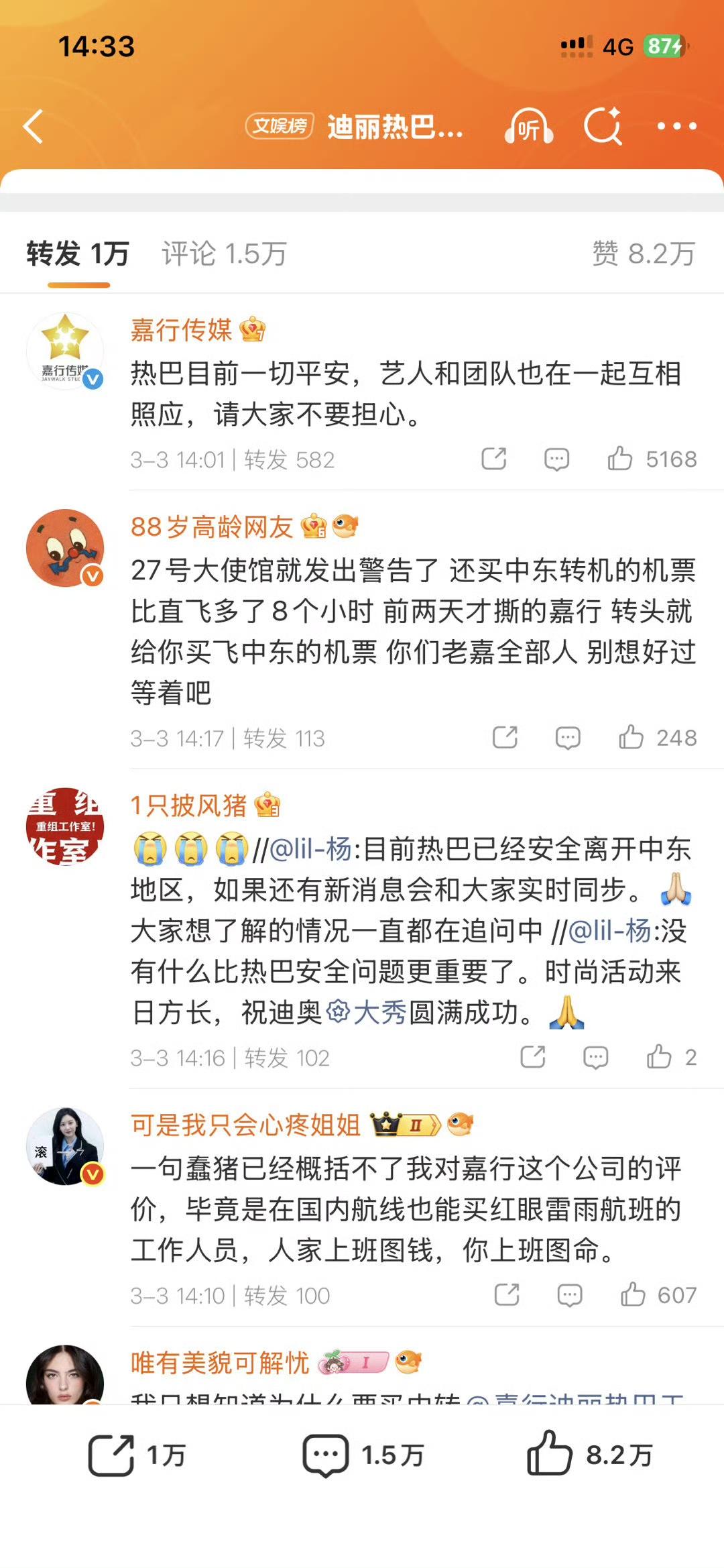 离谱,员工直飞,艺人中转,迪丽热巴确认无法如期参加巴黎DIOR时装周大秀! 迪丽热巴原计划以迪奥全球品牌大使身份出席3月3日的巴黎时装周,但因中转迪拜时遭遇航班全面停飞,滞留超过24小时,最终无法抵达巴黎。 工作室于3月3日发布公告,确认缺席DIOR大秀,并向品牌方、粉丝多次鞠躬致歉,称热巴对错过活动“深感遗憾”,并表示迪丽热巴及随行人员均平安,目前团队相互照应,并已尝试多种方案未果。 离谱的事,有粉丝爆料,热巴工作室员工都直飞,但给艺人买中转票,从北京又或是上海27号都可以直接直达但是没有选择,还是在这几个安全的选项中选择了最危险的地方转机,工作室的ip甚至还在北京! 嘉行是故意的吗?中东局势不是突然发生的,可以直达为什么要给艺人买中东转机,到底是多恨,还是纯工作失误。 难道是因为热巴到期不续就拿艺人生命开玩笑吗? 热巴已经滞留好几天了,希望热巴和中国同胞们都平平安安的!