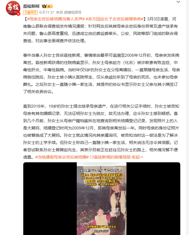 多方回应女子去世后被嫁弟弟母亲去世后被结婚当事人发声 河南鲁山,孙女士母亲2008年突发疾病离世,2018年孙女士继承遗产受阻,后发现母亲离世一年后有结婚登记记录,照片为大舅妈,身份证照片也被替换。亲属称此举是为解决孙女士上学手续,孙女士并不认同。目前联合调查组已介入,后续进展待关注。
