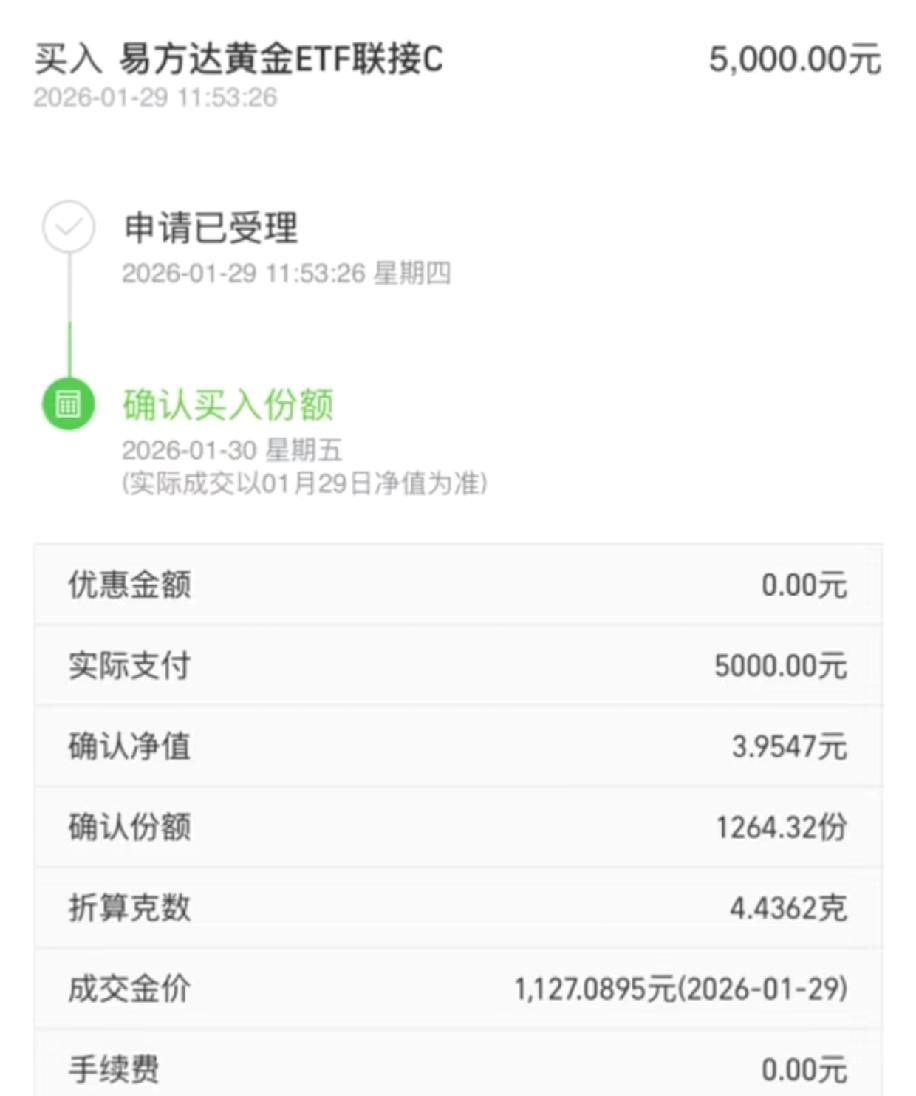 我第一次买易方达黄金ETF联接C,一月底花五千块买的,折算下来是4.4362克黄金,当时的成交金价是1127.0895元,确认的基金净值是3.9547元。到了三月二号把手里的份额全卖了,看到显示的卖出价是1190元,想着金价涨了63元,怎么着也能赚点,结果实际成交金价只有1088.6715元,基金确认净值也跌到了3.8199元,最后到手只有4829.58元,不光没赚钱还亏了钱。明明看到金价的数字涨了,实际结算的金价却降了,基金的净值也跟着变低,搞不懂这两个价格到底是咋算的,为啥表面金价涨了,实际卖了还会亏钱。