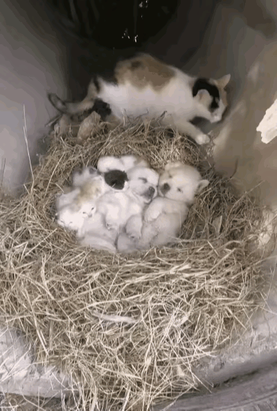 我亲眼看见的! 流浪猫妈独自带娃,还捡回两只孤儿奶狗,看完直接破防了! 那天风凉,我路过一个地下洞口,无意间看到一只流浪母猫,刚生完小猫,自己叼干草铺窝,已经够辛苦。 可它出去找吃的时,又发现了两只没人管的小奶狗,狗妈妈早已不见踪影。 我本以为它会自顾不暇,没想到它毫不犹豫,把这两个小可怜也带回了洞里。 小小的窝里,挤着它自己的小猫,还有两只奶狗,挤得满满当当,却格外温暖。 它自己都在流浪,食不果腹,却拼尽全力照顾毫无血缘的孩子。 一趟趟找吃的,一遍遍加固小窝,用最微弱的力量,撑起一个遮风挡雨的家。 原来最伟大的爱,从来无关血缘,也无关物种。明明身处泥泞,却还想着为别人撑伞。 这样温柔又坚强的猫妈妈,是不是瞬间戳中了你?你被它感动到了吗?