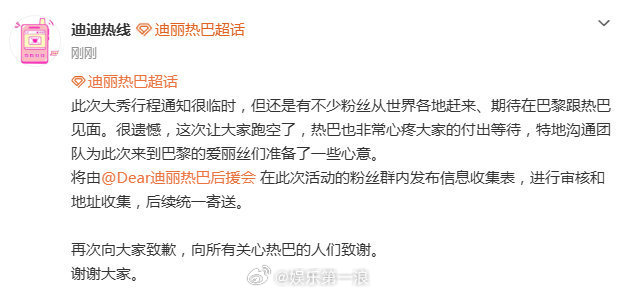 迪丽热巴补偿巴黎粉丝迪丽热巴为巴黎粉丝准备了一些心意 迪丽热巴对接发文,称热巴也非常心疼大家的付出等待,特地沟通团队为此次来到巴黎的爱丽丝们准备了一些心意。
