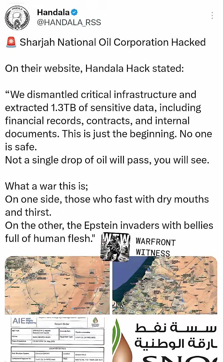 伊朗黑客出手!阿联酋石油系统被攻破,1.3TB机密数据全被盗! 伊朗黑客组织Handala直接宣布负责, 一举拿下阿联酋沙迦国家石油公司关键系统, 财务报表、内部合同,1.3TB绝密资料全部到手! 为啥专门打阿联酋? 很简单——阿联酋装了铺路爪雷达,数据实时共享给美以。 伊朗导弹一发射,人家马上就知道,这就是帮着美国对付伊朗! 美以这回真是走了一步臭棋。 把伊朗温和派全干掉,全国上下怒火冲天, 亲美派不敢吭声,伊朗现在只剩下硬干! 有网友说,想停火?没那么容易! 美国以色列现在想怂都来不及,伊朗已经彻底打疯了, 天上无人机炸,地下黑客攻,中东能源线全乱套! 笔者认为,有这本事,真该去黑以色列摩萨德, 把内奸名单全扒出来,那才叫大快人心! 对此,你怎么看呢?