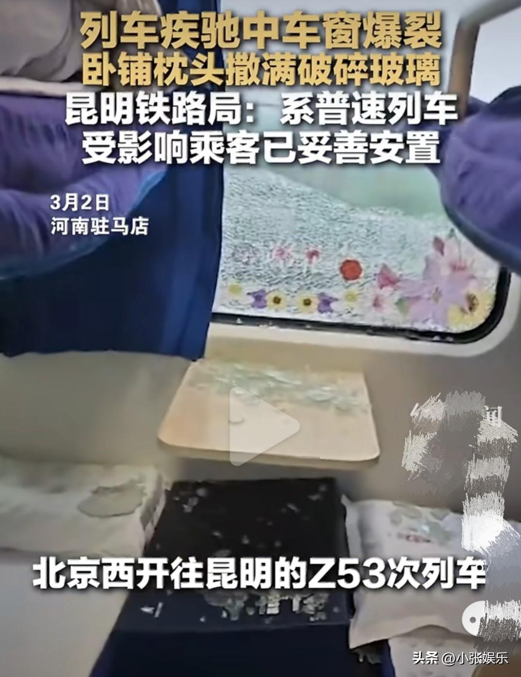 3月2日,从北京西开往昆明的Z53次列车,正跑着跑着,车窗突然“哐当”一声爆裂了! 现场视频看得人头皮发麻:卧铺车厢的窗边,枕头、床单上撒满了碎玻璃,冷风一个劲儿往车厢里灌。有乘客当时就在旁边,直接被吓懵了——好好坐着/躺着呢,突然就碎了,这也太危险了! 据昆明铁路局回应,这车是普速列车,爆裂的只是外层玻璃,内层还完好,所以不影响列车正常行驶,大家别慌! 事发的时候,列车正经过驻马店,工作人员反应特别快,第一时间把受影响的乘客转移走了。到下一站后,机械师和乘务员也赶紧下车检查,做了临时处理。 目前Z53次列车还在正常运行中,等回到昆明,会送到专门的地方彻底维修更换玻璃。铁路公安也已经介入,查清楚车窗到底为啥会爆。 不过也有网友担心:这么大的玻璃突然碎了,万一有人受伤怎么办?现在虽然说没人员受伤,但后续得给个准信儿啊! 还有人说,普速列车的车窗本来就该好好检查,别等碎了才补救。毕竟大家坐火车,最基本的就是求个安全,车窗这关键部件,可得盯紧点! 现在最关心的,就是到底是啥原因导致的爆裂,是温差问题、玻璃老化,还是有别的情况?希望能尽快查清楚,给所有乘客一个安心的答复。 也期待铁路部门能借着这事儿,好好排查下所有列车的车窗,别再出现这种惊险情况了。