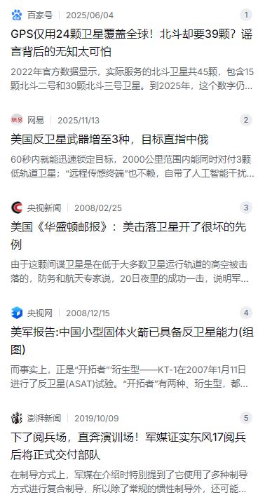 中美一旦开战,美国的第一击,不会是航母,也不是导弹,而是直奔中国的“眼睛”——北斗系统。但问题是:美国真能打掉北斗?即便打掉了,中国导弹就变成无头苍蝇了? 麻烦看官老爷们右上角点击一下“关注”,方便您进行讨论和分享,感谢您的支持! 最近几年,只要中美关系一紧张,网上就会冒出一种说法:一旦开战,美国第一波攻击既不是航母也不是导弹,而是直接奔着北斗系统去,打掉中国的“眼睛”。这说法听起来挺吓人,但仔细琢磨一下,美国真有这本事吗?就算北斗被戳瞎了,咱们的导弹真就成没头苍蝇了? 先说北斗本身是个什么体量。到2025年,北斗系统在轨卫星已经超过60颗,而且不是全挤在一块儿,而是分布在三种不同的轨道上。最关键的,有那么几颗“大块头”蹲在距离地球3.6万公里高的静止轨道上,这个高度,美国现在手里头的反卫星武器压根够不着。美国现役的主力反卫星手段,像标准-3型(SM-3)导弹,主要是用来对付低轨道卫星的,顶天了也就能打打两千公里高度的目标。你想打掉3.6万公里高的卫星?那已经不是导弹了,那是做梦。 再说了,就算美国真想硬来,用导弹一颗一颗往下打,这账也算不过来。把几十颗卫星全敲掉,得发射多少枚导弹?美国军方自己曾模拟过,这成本高得吓人,搞不好仗还没打,先把自家国库掏空了。而且太空战不是打游戏,打掉一颗卫星会产生大量碎片,这些碎片在轨道上乱飞,美国自己的卫星也得跟着遭殃,谁也跑不了。 美国人也知道硬杀伤代价太大,所以这些年换了路子,开始折腾卫星干扰器。比如他们搞的那个“梅多兰兹”和“远程传感终端”,号称能在2000公里范围内干扰低轨道卫星。听着挺玄乎,但说白了就是个信号屏蔽器。而且这东西一次也就能对付三两颗卫星,北斗在天上跑着几十颗,你干扰得过来吗?中国的应对办法也简单粗暴——多发射卫星。光是低轨通信卫星,中国计划到2027年就要发1.3万颗,你干扰器再厉害,面对上万颗卫星也只能干瞪眼。 再说了,北斗本身也不是傻白甜,它有自己的防备手段。早些年网上老有人拿卫星数量说事,说GPS只用24颗,北斗要几十颗,是不是技术落后?这纯属外行看热闹。北斗卫星多,是因为咱们搞的是“混合星座”,不仅有全球覆盖的中圆轨道卫星,还有专门在亚太地区上空“蹲坑”的静止轨道和倾斜同步轨道卫星。这些卫星信号强,在中国及周边地区,定位精度能做到比GPS还准。而且北斗卫星之间还能“聊天”——靠星间链路技术互相校准,就算地面站被端了,天上照样能自己算得明明白白。 最关键的是,中国的导弹根本不把全部身家性命押在卫星上。拿东风-17这种高超音速导弹来说,它用的制导方式是“复合制导”。啥意思?就是除了用北斗修正,还有惯性制导,导弹自己就能算自己飞了多远;快到目标了,还有地形匹配或者雷达成像,拿地上的山头楼群当参照物,照着照片打。这就好比你开车进隧道,GPS没信号了,你照样能凭感觉和路牌开出去。有军事专家专门解释过,在北斗支持下,东风导弹的复合制导不仅精度高,而且完全自主。真到了打仗的时候,哪怕北斗信号被掐了,导弹照样奔着目标去。 再说回美国,他们老拿“打北斗”说事,其实更多的是心理战。这些年看着北斗越做越大,美国人心里头确实有点急。过去GPS一家独大,美国能在科索沃战争关你信号,能在斩首行动上搞精准定位,那叫一个顺手。现在北斗起来了,苹果手机用北斗,东南亚铁路用北斗,连非洲种地都用上了北斗,美国那种“技术开关”式的霸权不好使了。他们喊“打北斗”,一方面是给国内壮胆,另一方面也是想吓唬人,看能不能扰乱军心。 真到了实战层面,中国不光有防的本事,还有反制的能力。早在2007年,中国就成功用导弹打下来过一颗废弃气象卫星,这说明什么?说明咱们也懂反卫星的技术。后来这些年,外媒还老炒作中国在搞高功率微波武器、激光武器什么的。说白了,你有狼牙棒,我有金钟罩,真要动手,美国那些高价值的GPS卫星和侦察卫星,也不是就绝对安全。 说到底,战争不是过家家,谁也不会一上来就把压箱底的家当全押上。美国炒“打北斗”,那是把中国当成了伊拉克那种没卫星就抓瞎的国家。但现实是,北斗是一个打不烂、补位快的系统,地面还有一堆备用卫星等着,哪颗被打掉,几分钟就能补上去。再加上中国导弹本来就不全靠它指路,这套组合拳下来,美国人自己心里也清楚,打北斗这招,也就是嘴上过过瘾罢了。