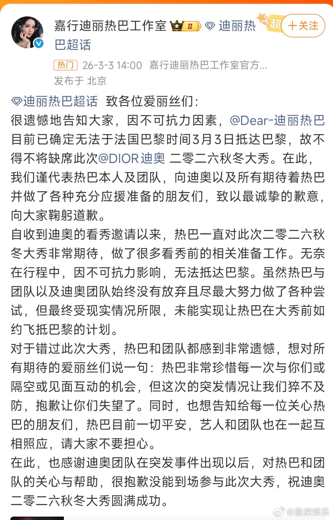 迪丽热巴 滞留迪拜看着真的太寒心了。外交部早就发了预警,北京上海明明有直飞,结果工作人员直飞巴黎,把艺人安排在风险中转路线上。一句“不可抗力”就想抹平所有失职?安全不是事后的一句“已转移”,是提前的预判和守护。