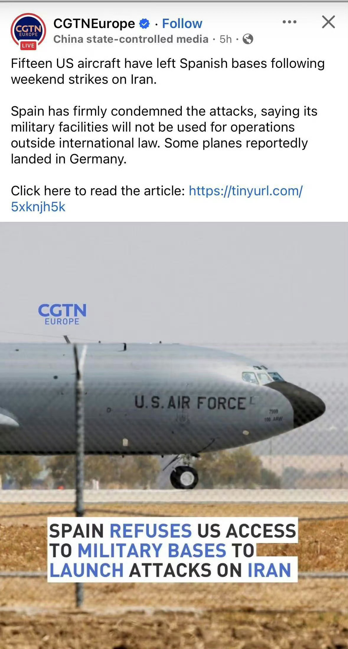 西班牙:美国违反国际法,恕不奉陪!重大新闻:西班牙将美国飞机逐出其基地!据