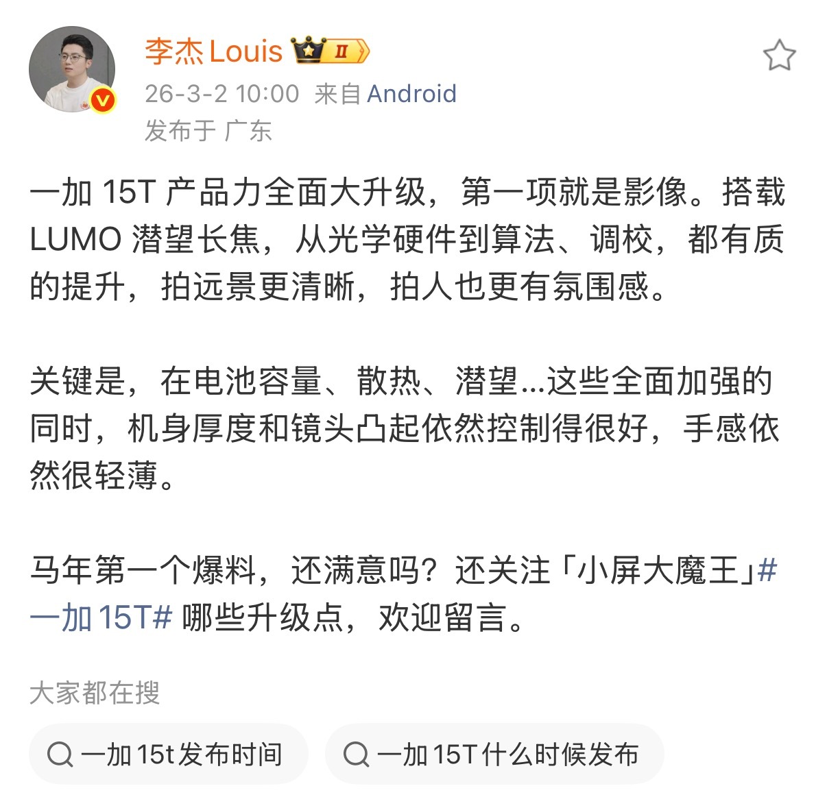 一加15T最近有不少预热和爆料信息了,大概看了一下,升级还算有诚意,影像有看点,小巧精致感方面也下了功夫做窄边框,设计也向主流靠拢。不过现在小屏旗舰做的比较好的其实就三家,苹果、小米和vivo,别家想要挤进来还是挺难的。没有特点还是不行,一加现在压力比较大,还是在有限资源下想着多搞一些吸引人的东西。