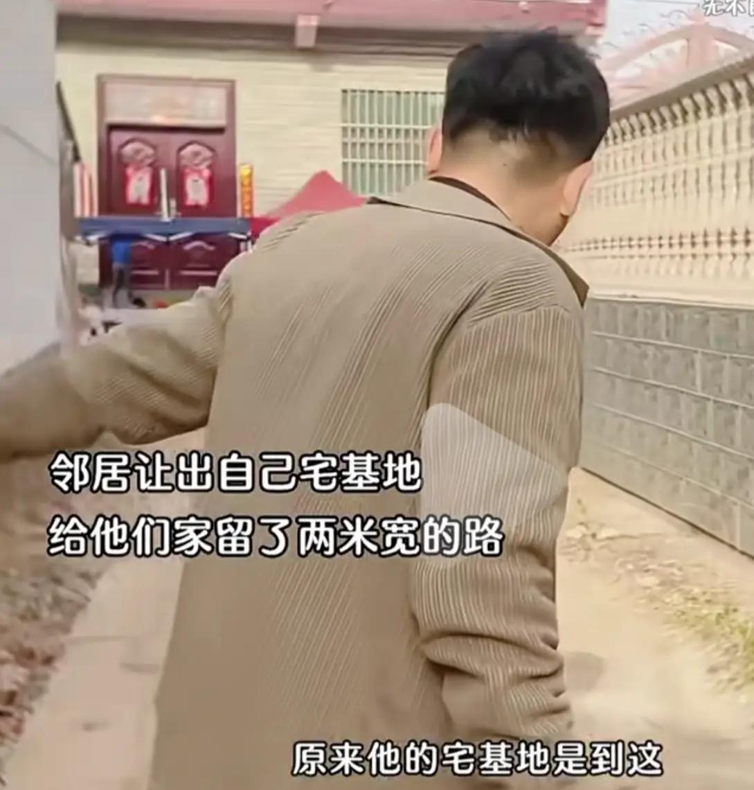 河南,男子回老家过年时发现邻居家盖了新房,但令他没想到的是,对方竟然在自己的宅基地里留了一条路,就为了男子回家的时候不用绕路,男子第二天拿着礼品上门感谢,结果对方说什么都不收,反而让男子都不好意思了。 男子常年在外打拼,只有过年才会回到老家。今年刚进村口,他看到邻居家新建了一栋宽敞明亮的新房,原本老旧的院落焕然一新,看得出来是精心修建的。可当他走近自家老宅时,发现邻居家的新房,竟在自家宅基地范围内,特意留出了一条通道。 这条小路不宽,却刚好能通行,直直通向男子家的门口。要知道,农村建房讲究方正规整,邻居完全可以把宅基地占满,不留任何空隙。可对方没有这么做,而是主动让出一部分土地,修出这条小路,只为男子回家时不用再绕远路、走泥路。 男子瞬间明白,邻居这是专门为他考虑。常年在外,家中无人常住,邻居却始终记挂着他返乡的不便,在建房这样的大事上,默默把方便留给别人。这份不声不响的善意,让男子心里又暖又酸,当即决定上门好好感谢。 男子精心准备了礼品,专程来到邻居家表达谢意。他诚恳地向邻居道谢,说自己常年不在家,多亏邻居处处惦记,还特意留路,解决了他回家的大麻烦。可无论男子怎么劝说,邻居始终不肯收下礼品,脸上还带着朴实的笑容,一个劲摆手推辞。 邻居说,远亲不如近邻,大家住在一起本就该互相照应,留条路不过是举手之劳,根本不值得放在心上,更不用特意送礼感谢。