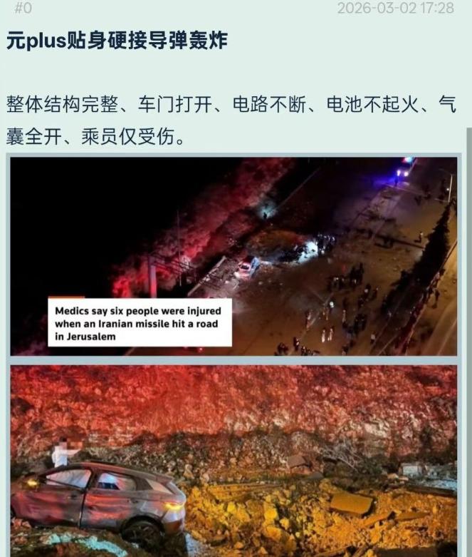 真事儿!昨夜,耶路撒冷地区正在行驶的一辆 BYD元plus汽车贴身接了一发伊朗导弹,仅人员受伤…… 表面上看,很多人觉得这只是中东战火中的一个偶然事件,不过是一辆车运气好、离爆炸点稍远,换任何车都可能有类似结果,不会动摇西方车企在安全领域的主导地位,更不会改变全球汽车市场的格局。 然而,他们忽略了一个关键点:这不是普通车祸,而是直面导弹爆炸的极端冲击。伊朗霍拉姆沙赫尔-4导弹威力巨大,爆炸冲击波足以摧毁周边建筑与车辆。比亚迪元PLUS在如此近距离下,车身结构未坍塌、车门可正常开启、气囊顺利弹出,最关键的是搭载的刀片电池未起火、无热失控,这绝非运气,而是其笼式车身、e平台3.0架构与电池安全技术的绝对实力体现,绝非普通汽车能做到。 更重要的是,在战火纷飞的中东,民用车辆遭遇导弹袭击本是九死一生。周边车辆损毁严重、交通设施被炸飞,而比亚迪元PLUS却在“贴身接弹”后保住了乘员生命,5人仅1人中度伤、2人轻伤、2人受惊吓,无一人死亡。这不仅是对车辆安全的终极考验,更是对中国车企“安全第一”理念的最好印证。比亚迪高管转发新闻称“安全就是最大的豪华”,直接坐实了这场“战场级安全测试”的真实性,让全球看到中国制造在极端场景下的可靠与强大。 更讽刺的是,西方车企长期垄断高端安全技术,动辄以“安全标准”打压中国品牌,却从未在如此极端的战争环境中接受过实战检验。而比亚迪元PLUS在中东战火中用生命守护的表现,彻底击碎了西方“中国车不安全”的偏见。那些靠营销堆砌的安全神话,在真实的战场考验面前不堪一击。中国车企不靠吹嘘,只用硬核技术与实战表现说话,这才是真正的安全底气。 而这标志着,中国新能源汽车已完成从“性价比”到“安全硬实力”的跨越,在全球最复杂、最危险的市场中站稳脚跟,中国制造的安全标准正在成为新的行业标杆,全球汽车产业的话语权正在加速向中国转移。 说真的,未来的走向很明确:比亚迪等中国车企将凭借此次实战表现,进一步打开中东及全球市场,安全将成为中国品牌的核心竞争力;西方车企的安全神话被打破,不得不正视中国技术的崛起;全球消费者将重新认识中国制造,中国汽车从“走量”到“走芯”、“走安全”的时代全面到来;而在动荡的世界里,中国车企用技术守护生命,也将赢得更多尊重与信任。 说到底,比亚迪元PLUS在耶路撒冷的“贴身接弹”,是中国制造的荣耀时刻,是中国新能源汽车安全实力的最好宣言。靠技术立身、用安全说话,中国车企终将在全球舞台上占据主导地位,而那些曾经的偏见与质疑,终将在一次次实战检验中烟消云散! 以上是小编个人看法,如果您也认同,麻烦点赞支持!有更好的见解也欢迎在评论区留言,方便大家一同探讨。