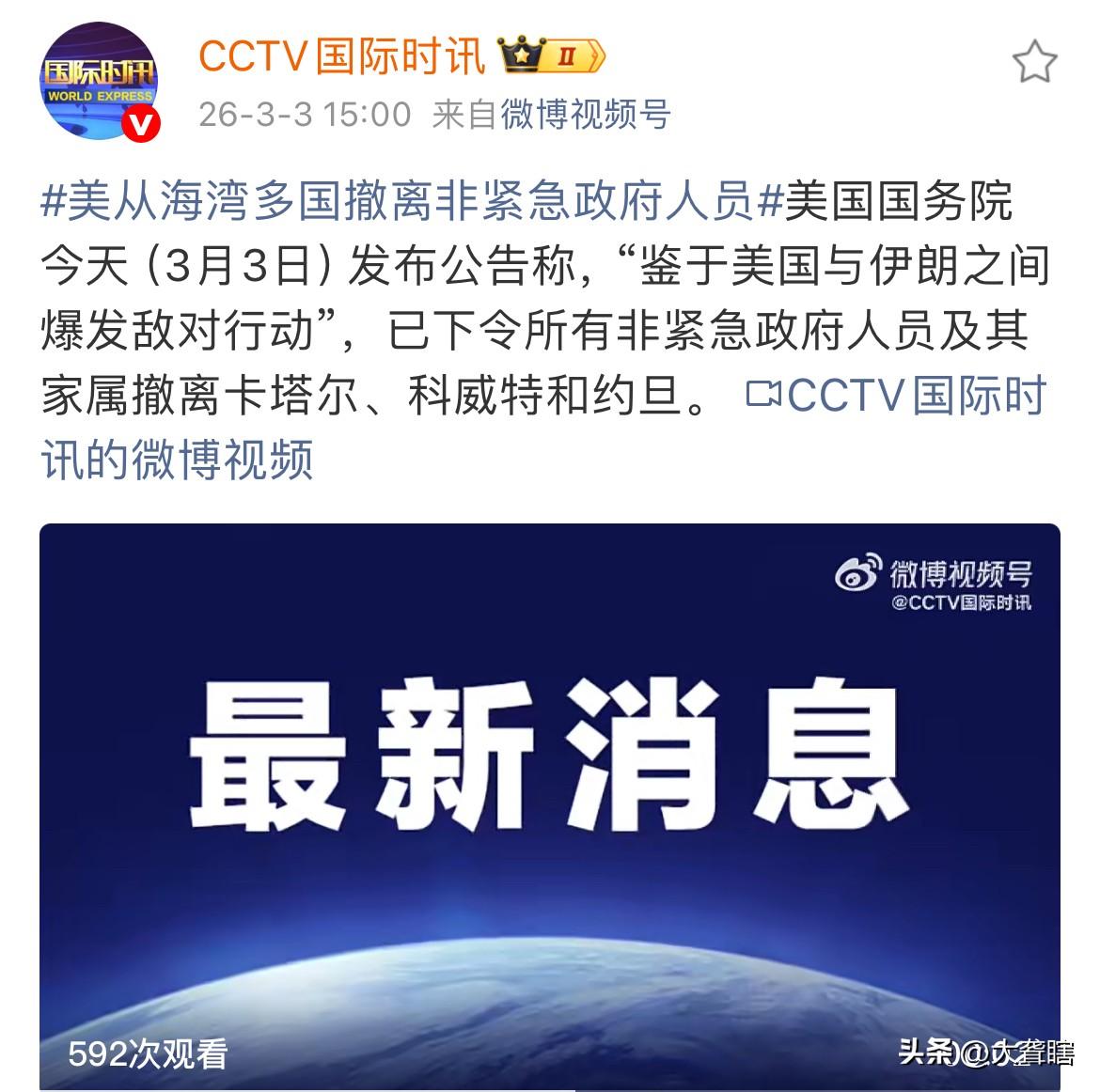 美国政府要求非紧急政府人员需紧急撤离海湾国家! 据国际时讯消息,美国国务院今天发布公告,由于美国和伊朗的关系紧张,美国政府要求所有在卡塔尔、科威特和约旦的非紧急美国政府人员及其家属紧急撤离。 自美以联军袭击伊朗后,美国在中东的军事基地以及领事馆等都有可能成为伊朗军队的打击目标,而在中东美国人将面临战争风险。