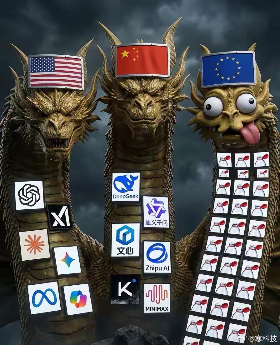 网友:美国有 ChatGPT、Grok、Claude、Gemini、Llama、Copilot中国有 DeepSeek、千问、文心、GLM、Kimi、MiniMax欧洲有瓶盖!