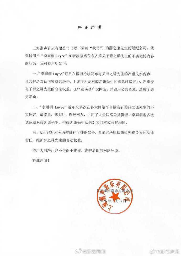 【#薛之谦方回应#李雨桐爆料】#薛之谦方将采取法律措施薛之谦 医闹尿壶电线杆事件##薛之谦好友吐槽张杰谢娜##李雨桐 薛之谦说周杰伦就喜欢混血脸##李雨桐回应谢娜喊话##薛之谦是按节目设定说的在场嘉宾##李雨桐称李雪琴见到她翻白眼##谢娜 张杰一辈子只爱唱歌##谁能像谢娜爱张杰一样爱我##薛之谦粉丝现状#(津云新闻)