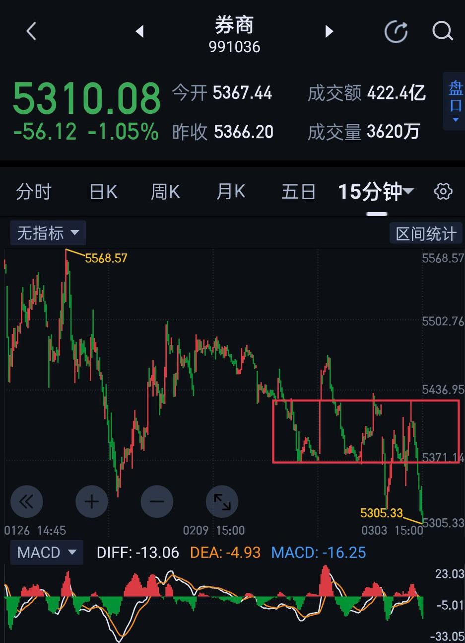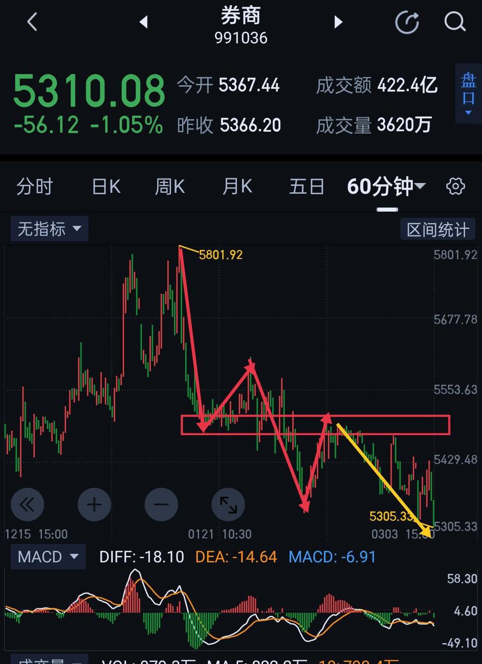 券商板块,跟随大盘调整,今天呈破位下行态势。目前日线图结构(图1),已形成三十分钟中枢的向下离开段。后期可用是否形成盘整背驰的视角跟随。 从5801开始的向下离开段,在六十分钟图上(图2)已形成一个中枢,后期围绕该中枢能否形成背驰,将是券商后期是否启稳的关键。 再小的结构十五分钟图(图3),今天是围绕该图中枢震荡的结构。明天可观察围绕(图3)继续震荡还是能形成三买或三卖,结合走势呈现的结构完成及时应对即可。券商后期暂可观察5250附近的支撑。(图中黄色箭头是待完成走势。)