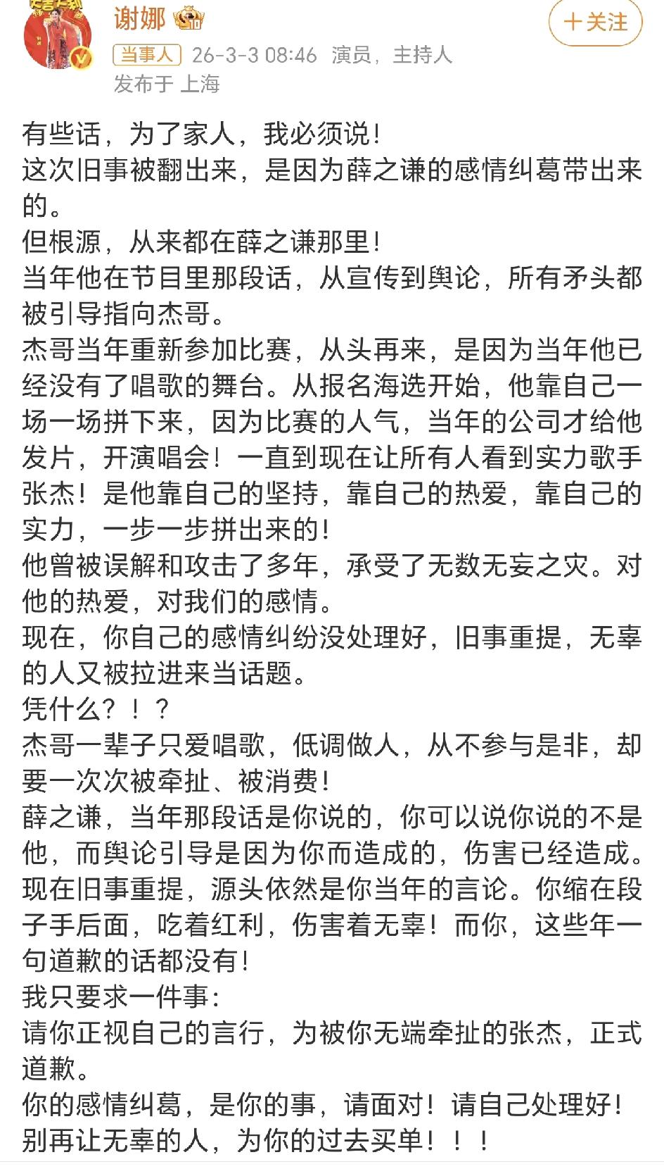 薛之谦的事儿越扯越大,有一种中东战争乱成一锅粥的感觉[捂脸]! 李雨桐持续爆料,看起来前言不搭后语,但是真点名啊,张杰,胡彦斌,殃及无辜一大片! 这边薛之谦还没回应,没想到谢娜先出来讨伐了,到底薛之谦说了张杰什么啊,让谢娜这么激动! 以薛之谦和张杰现在在歌坛的地位,真的没必要这时候出来讨说法,张杰都没说话,谢娜就更不该发声,薛之谦现在估计已经焦头烂额,这陈芝麻烂谷子的事情,有点丢人! 现在薛之谦方已经发声明要追李雨桐究责任,对谢娜要求道歉的事却置之不理,这可真热闹了! 我不关心李雨桐最后怎么收场,我就想看看谢娜最后怎么收场,张杰和薛之谦再也不见面了吗? 娱乐是个圈,这弯弯绕绕的,多少年了也没迈过去,单说张杰这个人其实也蛮不错的,非常努力,也很有担当,奈何过往总是有非议啊!谢娜 张杰 薛之谦