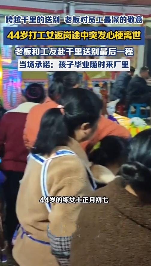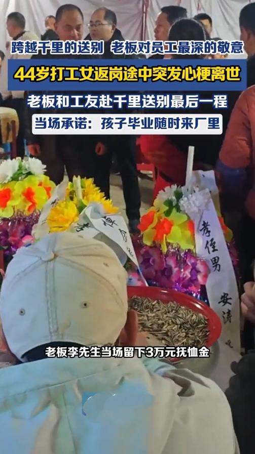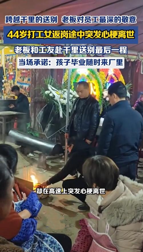 谁看了不眼眶发热啊!贵州的练大姐正月初七返岗,高速上突发意外走了——她在广东那家厂干了15年,从没迟到早退,年年拿优秀员工奖。 谁能想到,老板带着三十多个同事,坐飞机转包车,冒雨在山路上颠了俩小时,钻进贵州的小山村送她最后一程。灵前放下3万抚恤金和同事捐款,还拉着她高三的女儿手说:“大学毕业就来厂里,阿姨们给你留岗位。” 村里人都说:“打了一辈子工,没见过这样的老板!” 其实哪是老板特别,是15年的相处早把雇佣关系熬成了家人——她记着车间的生产表,他念着她家孩子的升学考。 这样的情谊,是不是比冰冷的劳动合同暖多了?换作是你,遇到过把员工当家人的老板吗?评论区讲讲你的故事。 来源:海报新闻 打工女返岗途中离世 老板赴千里送别