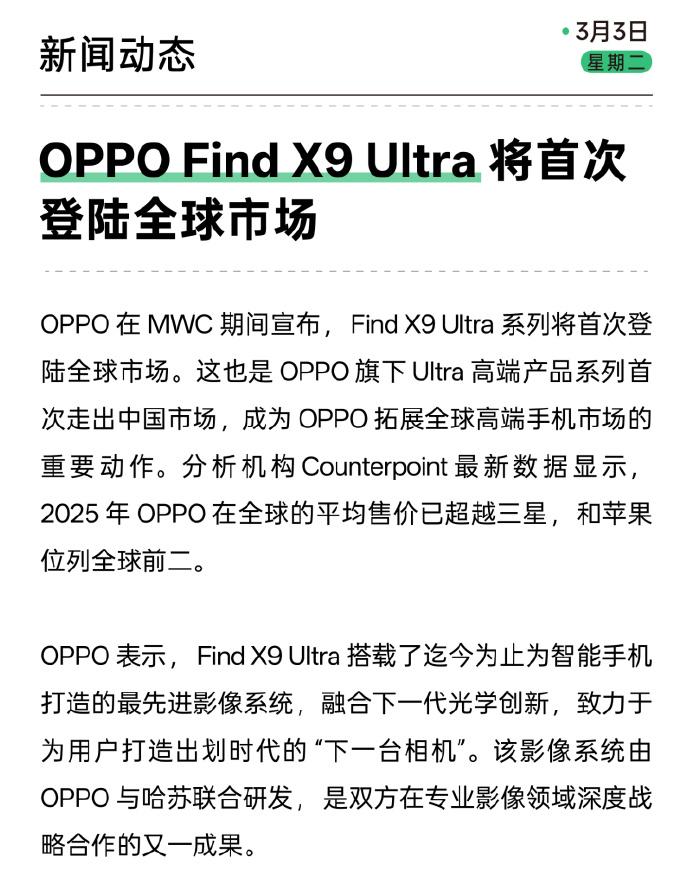OPPO Find X9 Ultra这配置太炸裂了吧! 🙋♀️很快嗷,超大杯OPPO Find X9 Ultra也要来了! MWC 2026期间OPPO正式官宣Find X9Ultra将首次登陆全球市场! 整理一波爆料配置,大家觉得能不能卖爆? 👇最重磅的影像系统升级是十分炸裂 据说是今年超大杯旗舰机里面,唯一的双2亿+唯一十倍光变 首颗2亿超大底潜望长焦➕2亿像素3X长焦➕5000万像素10X 超长焦➕5000万大底超广角➕+丹霞原彩镜头 双2亿双潜望五摄哈苏影像再升级,镜头堆料这一块OPPO是真的狠,据说这次还有新一代哈苏外置镜头,补强望远能力,争做演唱会神器🔭 难怪敢说是为用户打造出划时代的『下一台相机』 毕竟是超大杯,除了影像外的其它配置自然也是拉满的 ⭕骁龙8 Elite Gen5处理器 ⭕6.82英寸京东方2K直屏屏幕 ⭕7000mAh+100W有线+50W无线 ⭕3D超声波指纹 😭配置是很顶,但现在就是很着急,OPPO你能不能搞快点!
