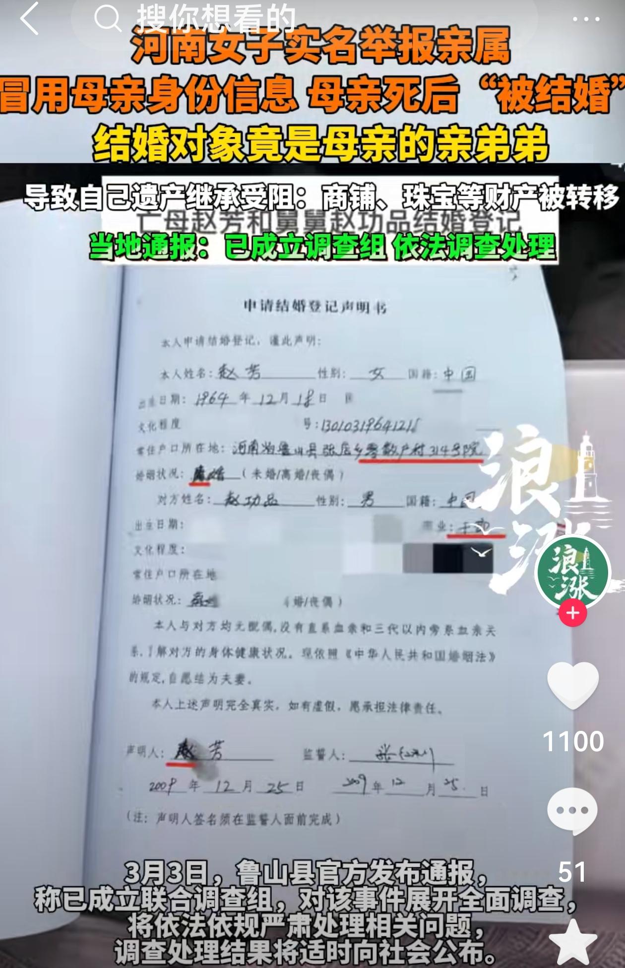 河南鲁山,女孩9岁时母亲去世,留下大量珠宝商铺。18岁她想继承遗产时,却发现母亲名下只剩一间小商铺!更诡异的是,她不是唯一子女,无法办理继承。女孩彻查后崩溃:死去多年的母亲,竟然“被结婚”了,结婚对象还是她亲舅舅! 2008 年 12 月,河南鲁山的孙艺菲迎来人生至暗时刻。 9 岁的她在医院被小姨接走,母亲赵芳因败血症与中毒性肝炎离世,彼时父母早已离异,家中留下的珠宝与多间商铺,成为她未来生活的唯一指望。 她没能参加母亲的葬礼,也无从过问遗产的去向,只能跟着小姨一家生活,等待成年后依法继承。 十年后的 2018 年,孙艺菲正式向相关部门提交遗产继承申请。 工作人员的告知让她瞬间陷入迷茫:系统显示其母亲存在后续婚姻记录,她无法被认定为唯一继承人,继承手续不予办理。 母亲已经去世十年,何来新的婚姻? 带着这份疑问,孙艺菲开始逐一向户籍、民政部门申请调取档案,试图找到问题的答案。 调查的结果,让成年后的孙艺菲彻底崩溃:死去多年的母亲,竟然 “被结婚” 了,结婚对象还是她的亲舅舅。 这份结婚登记记录的时间为 2009 年 12 月,恰好是赵芳去世满一年的节点。 登记信息里,男方是她的大舅赵功品,女方照片却并非母亲,而是她的大舅妈马某某。 这就意味着,一名已经离世的女性,在法律层面被 “复活”,还与自己的亲弟弟完成了婚姻登记,这不仅违背人伦,更直接制造出虚假的配偶与子女身份,从根源上阻断了孙艺菲的继承之路。 事实上,这场针对遗产的侵吞,从赵芳去世后第十四天就已启动。 2008 年 12 月 17 日,有人以赵芳的名义办理了房产出售委托书与律师见证书,委托孙艺菲的小姨处置其名下房产。 两天后,该房产完成交易,售房款全部转入小姨账户。 2009 年 1 月,赵芳的户口从河北石家庄被违规迁至河南鲁山,办理人签名为 “赵品”,与赵功品的名字高度重合。 一系列操作环环相扣,等到孙艺菲成年核查时,母亲留下的巨额遗产,仅剩下一间小商铺。 舅舅、舅妈与小姨的配合十分默契,先用虚假委托转移房产,再通过户籍迁移篡改身份信息,最后以伪造婚姻登记的方式,彻底锁定遗产归属。 面对孙艺菲的质问,亲属们以 “方便她上学” 为由进行解释,这样的说法显然站不住脚。 孙艺菲选择实名举报,将舅舅、舅妈与小姨的行为公之于众。 此事一经曝光,立刻引发关注。 人们难以理解,血脉相连的亲人,为何会对孤苦无依的外甥女痛下黑手,用一系列违法操作侵吞其应得的遗产。 更值得追问的是,户籍迁移、身份更换、婚姻登记等多个环节,本应有着严格的审核流程,却被轻易突破,背后是否存在监管漏洞与内部协助,亟待查清。 从法律层面来看,涉事亲属的行为已涉嫌伪造居民身份证、诈骗、非法转移财产等多项刑事犯罪。 孙艺菲的遭遇,也为所有人敲响了警钟。 父母离世后,及时办理继承权公证、留存死亡证明与财产凭证,定期核查户籍和婚姻登记信息,才能在最大程度上守护好自己的合法权益。 目前,调查仍在推进,人们期待着一个公正的结果,让违法者得到应有的惩处,也让孙艺菲的合法权益得到切实保障。