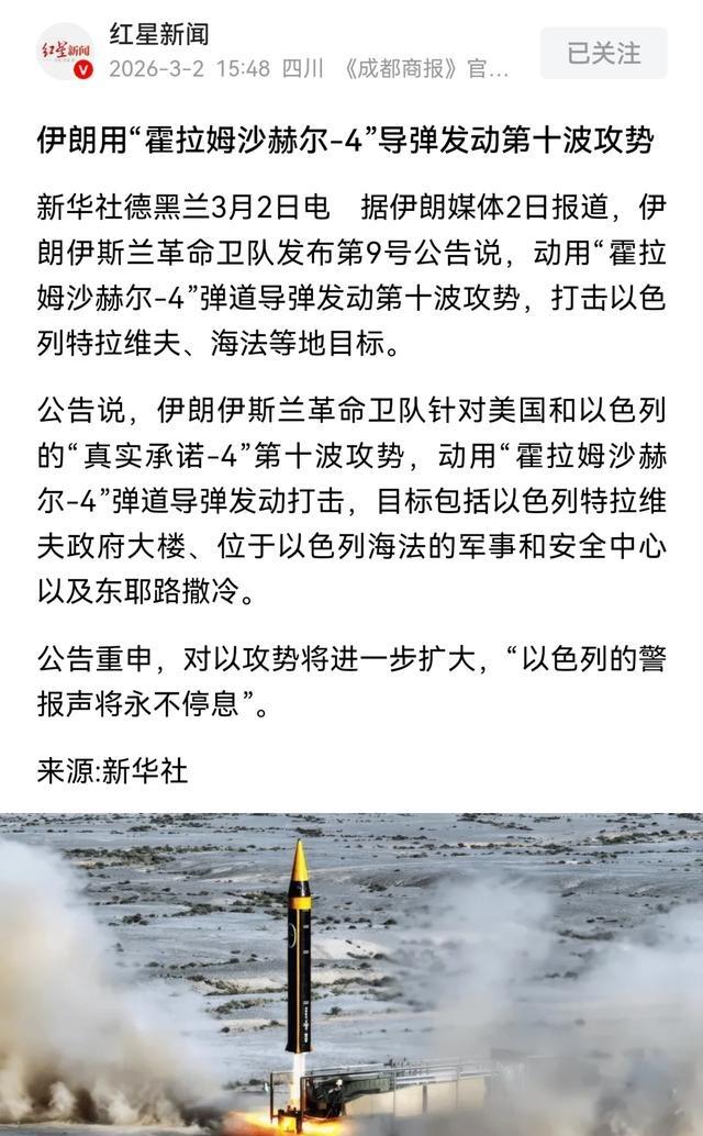 “霍拉姆沙赫尔-4”是伊朗目前最先进的弹道导弹之一,射程2000公里,配备一个重达1500公斤的重型弹头,如此大的载荷使其具有极强的破坏力,足以摧毁大型机场,指挥中心等军事设施。大气层外可达16马赫,重返大气层可达8马赫,虽然是液体燃料推进技术,准备时间较长,但技术成熟成本低,具末端机动变轨能力。 霍拉姆沙赫尔-4是伊朗现阶段弹道导弹序列里技术水平最高的那一款,射程基本锁定在2000公里左右,弹头重量1500公斤这个数字让它在同类导弹里显得特别突出。载荷这么大,直接决定了它的破坏半径远超很多中程导弹,一发下去能把大型机场跑道炸得没法用,指挥中心那种加固建筑也很难扛得住。伊朗把这款导弹叫Kheibar Sheikh,公开资料显示它在2023年正式亮相,属于液体燃料单级推进,整体长度13米出头,直径1.5米,发射重量大概30吨。 伊朗搞弹道导弹这条路是从两伊战争那会儿开始的,当时只能靠买外国货顶着。战后他们意识到光靠进口不行,就慢慢转向自己研发。霍拉姆沙赫尔系列最早的技术来源是朝鲜的BM-25导弹,那玩意儿本来是苏联R-27潜射导弹的陆基改型。伊朗大概在2000年代中期拿到相关技术资料和部件,然后在国内工厂一步步拆解、测绘、替换零件,实现国产化。2017年1月第一次试射,飞了950公里左右,9月在阅兵式上第一次露面,当时就取名霍拉姆沙赫尔,纪念1980年代那场城市保卫战。 早期版本问题不少,弹体稳定性差,射程和精度都达不到宣传数字。 工程师后来重点改推进剂系统,用上了可长期储存的自燃推进剂,这样就不用每次发射前现加注,准备时间缩短不少。弹头段也加长到4米左右,内部空间重新布局,能塞下更大的载荷。2023年5月纪念霍拉姆沙赫尔解放周年活动上,伊朗国防部正式公布霍拉姆沙赫尔-4,强调它装了末端机动再入飞行器,弹头在最后几十公里可以用小型推进器变轨,轨迹变得不规则,防空导弹想拦就难多了。公开说法精度能到30米圆概率误差,对付固定目标基本够用。 实战部署方面,伊朗把这类重型导弹藏在地下设施里,所谓“导弹城”就是山体挖出来的隧道网络,里面导弹整齐排开,已经加注好燃料,技术人员定期检查阀门和接口。液体燃料虽然准备周期长,但成本低,技术也成熟,伊朗用这个思路把库存维持在一个可观的规模。2026年3月2日,伊朗伊斯兰革命卫队宣布在第十波攻击中动用了霍拉姆沙赫尔-4,对以色列境内几个目标实施打击,这是这款导弹第一次公开用于实战,射程覆盖以色列全境没问题。
