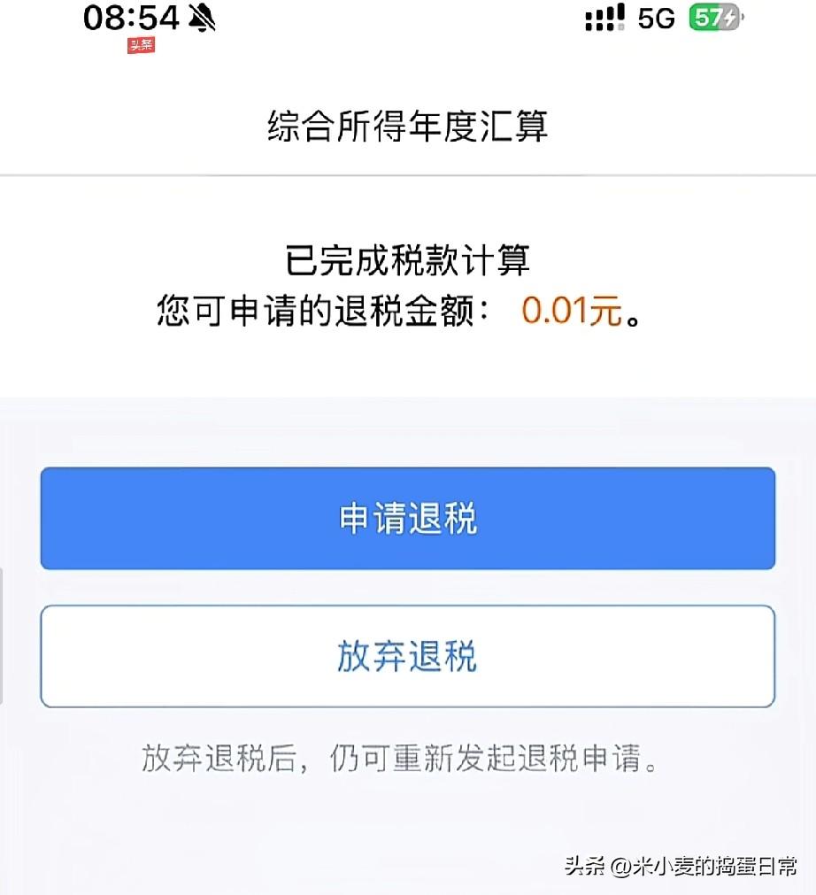 年度退税巨款! 这一分钱,是我今年最大的“巨款”! 今天打开个税APP,看到“可申请退税金额:0.01元”的时候,我整个人都愣住了。 手指在“申请退税”和“放弃退税”两个按钮之间反复横跳,心里五味杂陈。这一分钱,说它多吧,连个糖都买不到;说它少吧,它又代表着国家对我全年收入的“官方认证”。 不少网友晒出了同款“巨款”,有人说“这一分钱是我今年的开门红”,也有人调侃“我缺的是这一分钱吗?我缺的是能退几万的工资条!” 其实,退税多少从来不是衡量幸福的标准。这一分钱,更像是一种仪式感,提醒我们过去一年的努力都被看见。哪怕只有一分钱,我也会郑重地按下“申请退税”,毕竟,这可是我凭本事赚来的“第一桶金”啊!