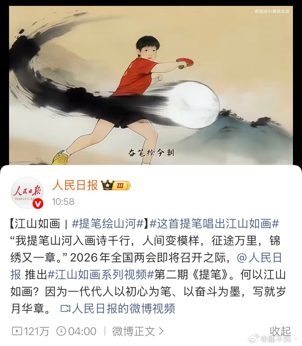 这就是中国精神今天人日的两条🔝微博,孙颖莎都作为体育代表出镜,她以球拍为笔,汗水为墨,在赛场上挥毫,是江山如画里最动人的华章!未来这幅“十五五”的美好蓝图,愿孙颖莎不负每一滴汗水,不负这盛世韶华,与万千有为青年一起共绘这江山如画,共赴下一个辉煌!💪🇨🇳提笔绘山河